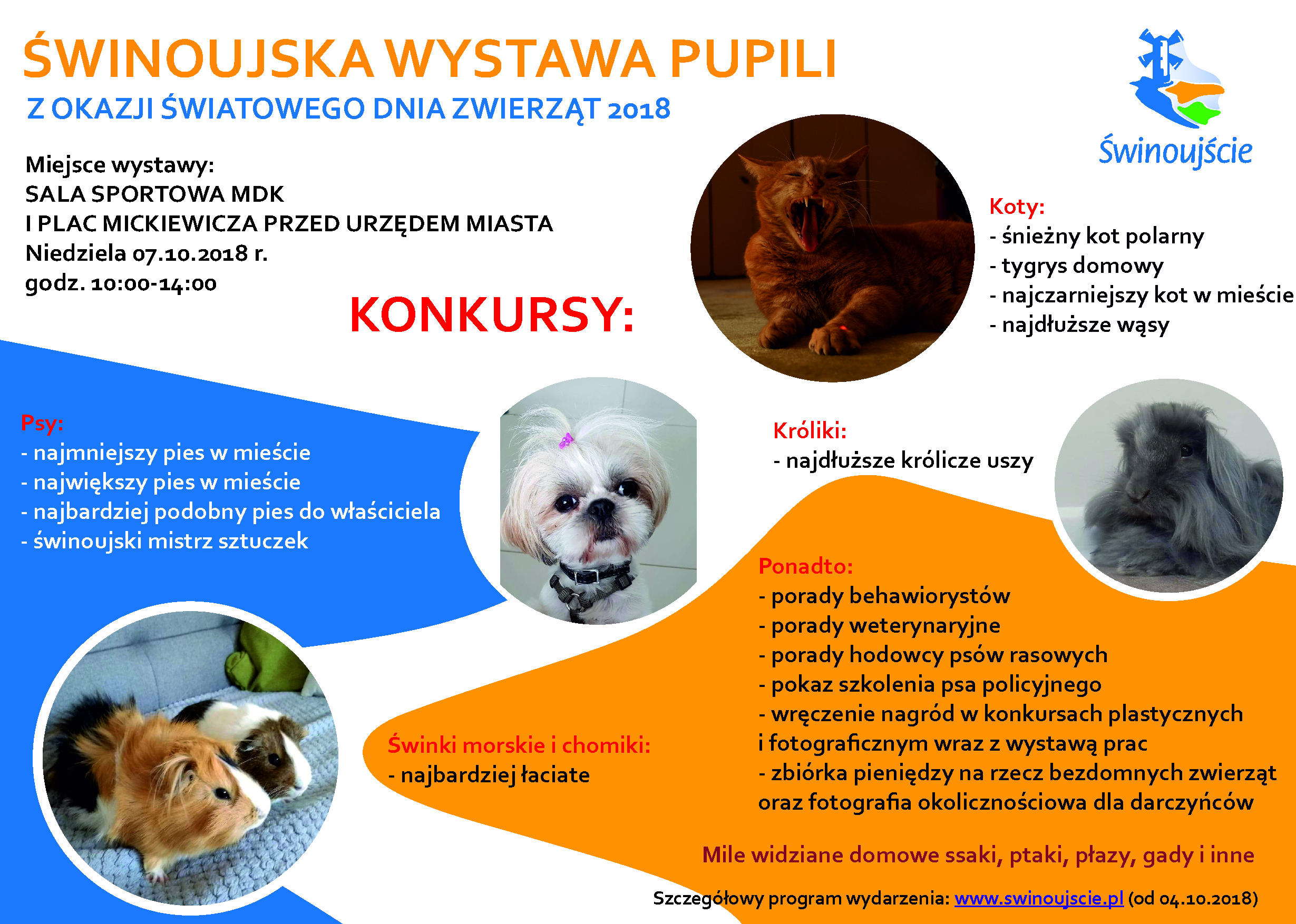 Z okazji Światowego Dnia Zwierząt po raz pierwszy w naszym mieście organizujemy wystawę naszych pupili. Miejsce: sala sportowa Miejskiego Domu Kultury przy ulicy Matejki (obok sali widowiskowej) oraz Plac Mickiewicza, czyli ten przed urzędem miasta.