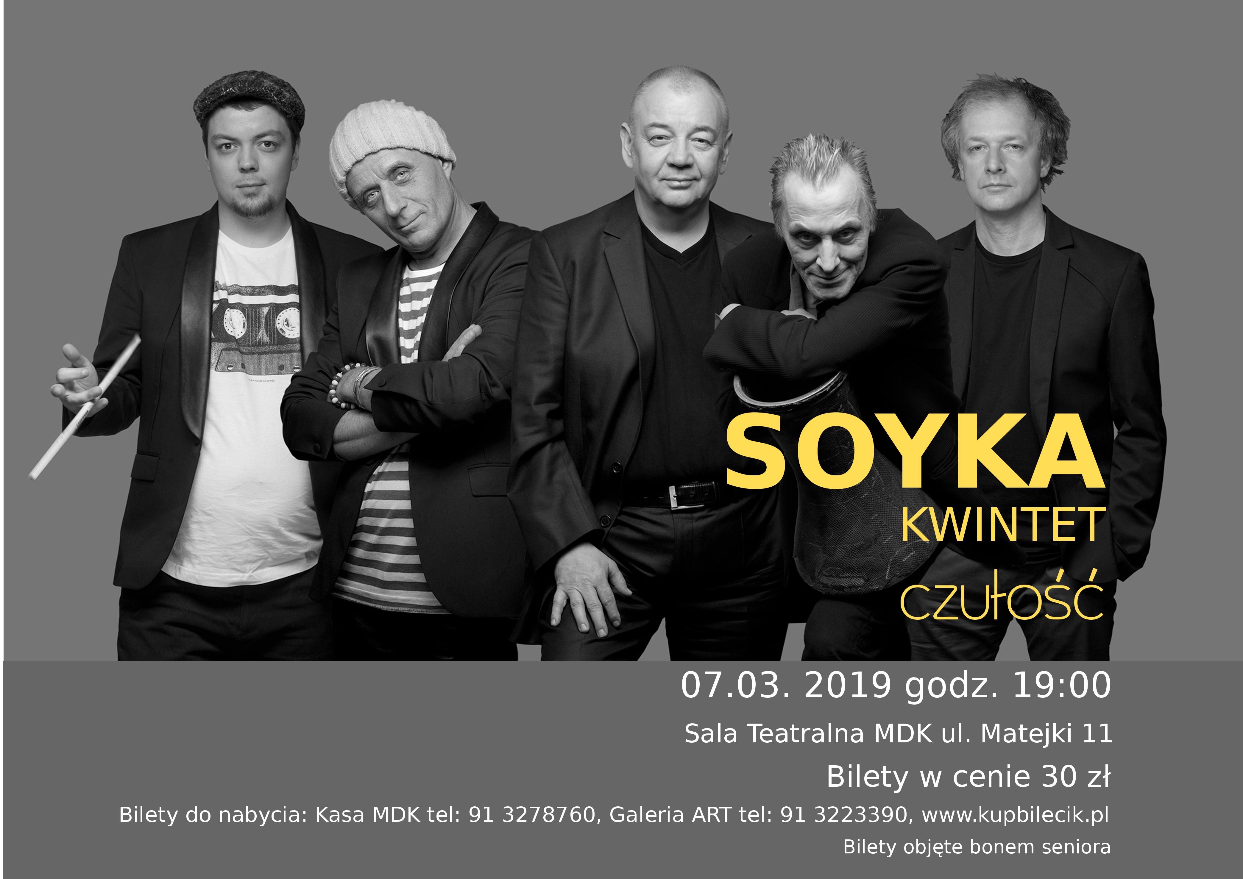 Tym razem wystąpi z zespołem SOYKA KWINTET. Towarzyszyć mu będą Przemek Greger na gitarze akustycznej, syn Kuba na perkusji, Zbyszek Uhuru Brysiak na instrumentach perkusyjnych oraz Antoni Gralak na trąbce. SOYKA KWINTET stanowi bogatą i niebywale ciekawą paletę kolorystyczną a jazzowe temperamenty i kompetencje wyzwalają podczas nagrań i w czasie koncertów tę unikalną moc muzyki improwizowanej.