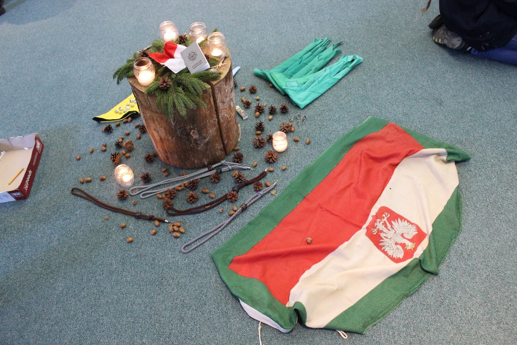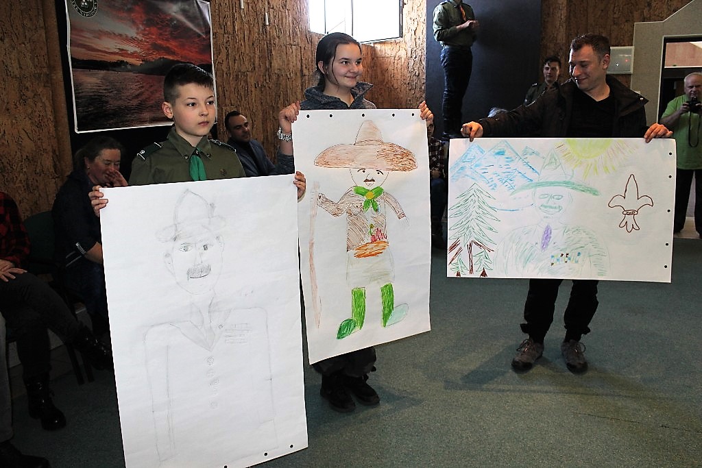 Po tym prowadząca świecowisko druhna pwd. Agnieszka Szymańska (drużynowa 3 DH „Gryfy Wolińskie” z Wolina) podzieliła uczestników na grupy, które miały zadanie narysowania portretu Baden-Powella. Wszystkim udało się to znakomicie, choć różne były techniki i końcowy wizerunek Naczelnego Skauta Świata. Były też pląsy a po nich kolejne zadanie polegające na przygotowaniu scenek, których przesłanie należało odgadnąć. Tu już było trudniej, ale ostatecznie jakoś poszło. Co ciekawe, razem z zuchami i harcerzami zaangażowali się w wykonanie tych scenek także zaproszeni goście.