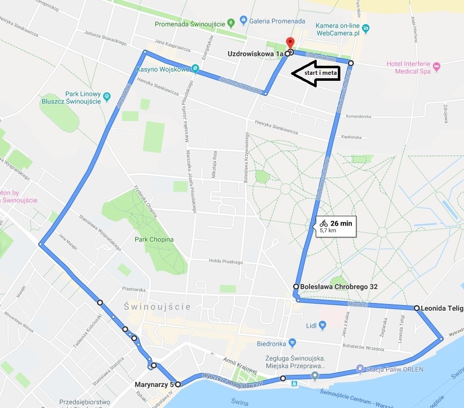 start i meta: ul. Uzdrowiskowa, rejon muszli koncertowej