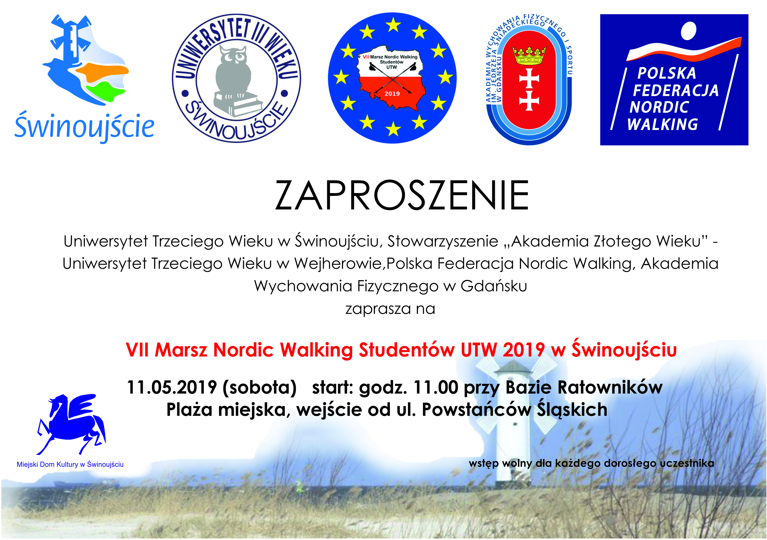 VII Marsz Nordic Walking Studentów Uniwersytetu Trzeciego Wieku 2019. Wstęp wolny dla każdego dorosłego. Start sobota 11 maja 2019, godzina 11.00 na plaży przy bazie ratowników. Zobacz więcej.