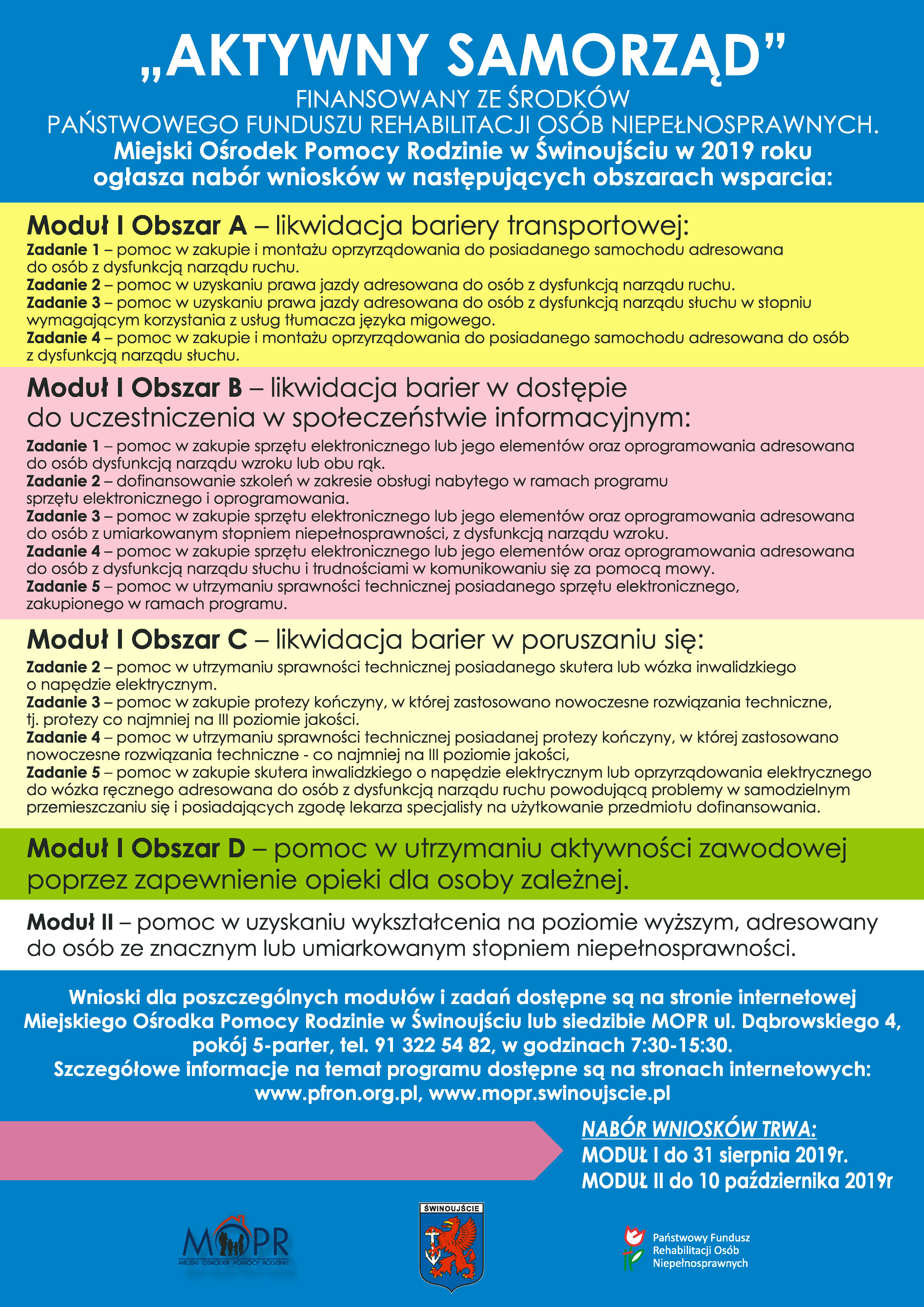 Uprzejmie informujemy, że podobnie jak w roku ubiegłym Miasto Świnoujście przystąpiło do realizacji pilotażowego programu „Aktywny samorząd”. Jednostką organizacyjną Realizatora programu jest Miejski Ośrodek Pomocy Rodzinie w Świnoujściu. Program jest finansowany ze środków Państwowego Funduszu Rehabilitacji Osób Niepełnosprawnych.