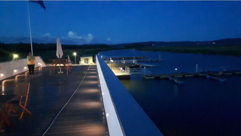 Marina ma 5 pomostów pływających. Ciekawostką jest budynek administracyjno- socjalny, na którego dachu znajduje się taras widokowy z pięknym widokiem na rozlewisko Świny. W budynku znajduje się część sanitarna dla żeglarzy z toaletami, natryskami i magazynem sprzętu. Na terenie mariny jest także część rekreacyjna z zadaszonym miejscem do grillowania i siedzeniami oraz parkingiem dla rowerów. Bo przystań ma służyć nie tylko żeglarzom, ale także „niepływającym” do spotkań i rekreacji, odpoczynku nad wodą. Cały teren jest zagospodarowany i oświetlony. Doprowadzone są też niezbędne inne media.