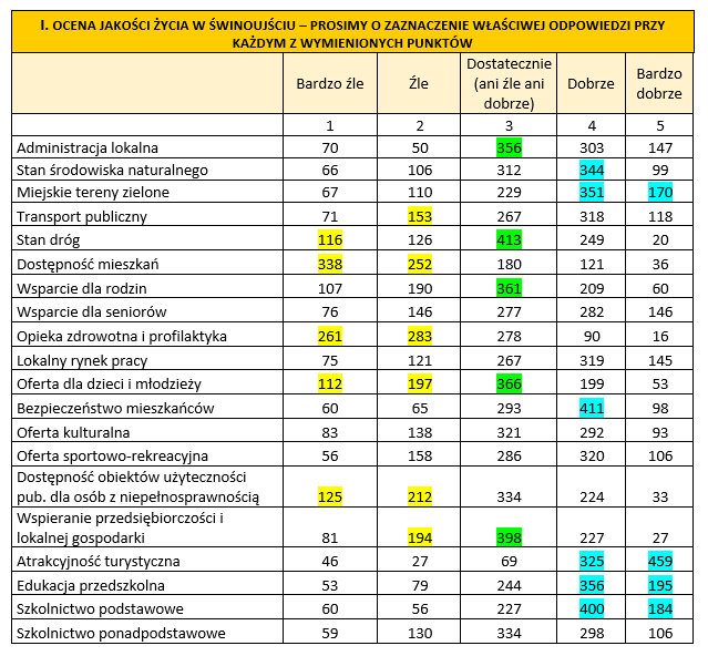 Odpowiadając na pierwsze pytanie dotyczące oceny jakości życia w Świnoujściu, ankietowani mieli za zadanie dokonać oceny w skali ocen: od bardzo dobrej do bardzo złej, w dwudziestu obszarach wskazanych w poniższej tabeli (kolorami zaznaczono odpowiedzi powtarzające się najczęściej).