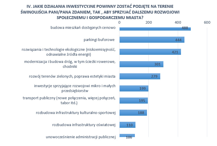 Kolejne pytanie dotyczyło tego co powinno się zrobić/poprawić aby Świnoujście mogło się rozwijać. Wyniki badania wskazują, że mieszkańcy Świnoujścia przede wszystkim odczuwają brak mieszkań dostępnych cenowo. 488 osób wskazuje na pierwszym miejscu budowę mieszkań jako priorytetowe działanie inwestycyjne do zrealizowania. 444 osoby podniosły brak miejsc parkingowych i chciałyby aby powstały parkingi buforowe w mieście. 421 ankietowanych uważa, że brakuje rozwiązań i technologii ekologicznych (niskoemisyjność, odnawialne źródła energii). Najniższą wartość w tym pytaniu otrzymał podpunkt dotyczący unowocześnienia administracji - 106 głosów. Wyniki prezentuje poniższy wykres: