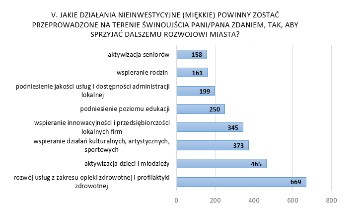 Piąte pytanie dotyczyło działań nieinwestycyjnych tzw. miękkich. W odpowiedzi na osiem wyszczególnionych obszarów, aż 669 mieszkańców sugeruje iż najważniejszą kwestią do rozwiązania jest rozwój usług z zakresu opieki zdrowotnej i profilaktyki. 465 osób sądzi, iż należy podjąć działania, by zaaktywizować dzieci i młodzież, a 373 ankietowanych uważa, iż należy wspierać działania artystyczne, kulturalne i sportowe.
