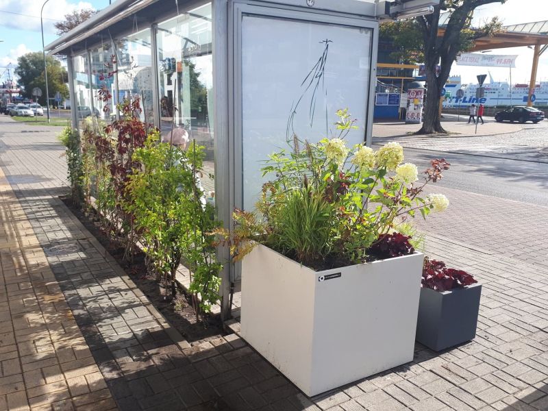 Na przystanku przy promach po bokach wiaty stoją cztery donice, w których rosną hortensje, żurawki, rozplenice, bzy. Tył wiaty przeznaczony jest na pnącza, które w przyszłości utworzą zieloną ścianę z winobluszczu, rdestowca, bluszczu, dławisza oraz wiciokrzewu Henriego. Przy okazji nasadzeń wymieniona została stara betonowa ławka i odmalowana ławka w samej wiacie.