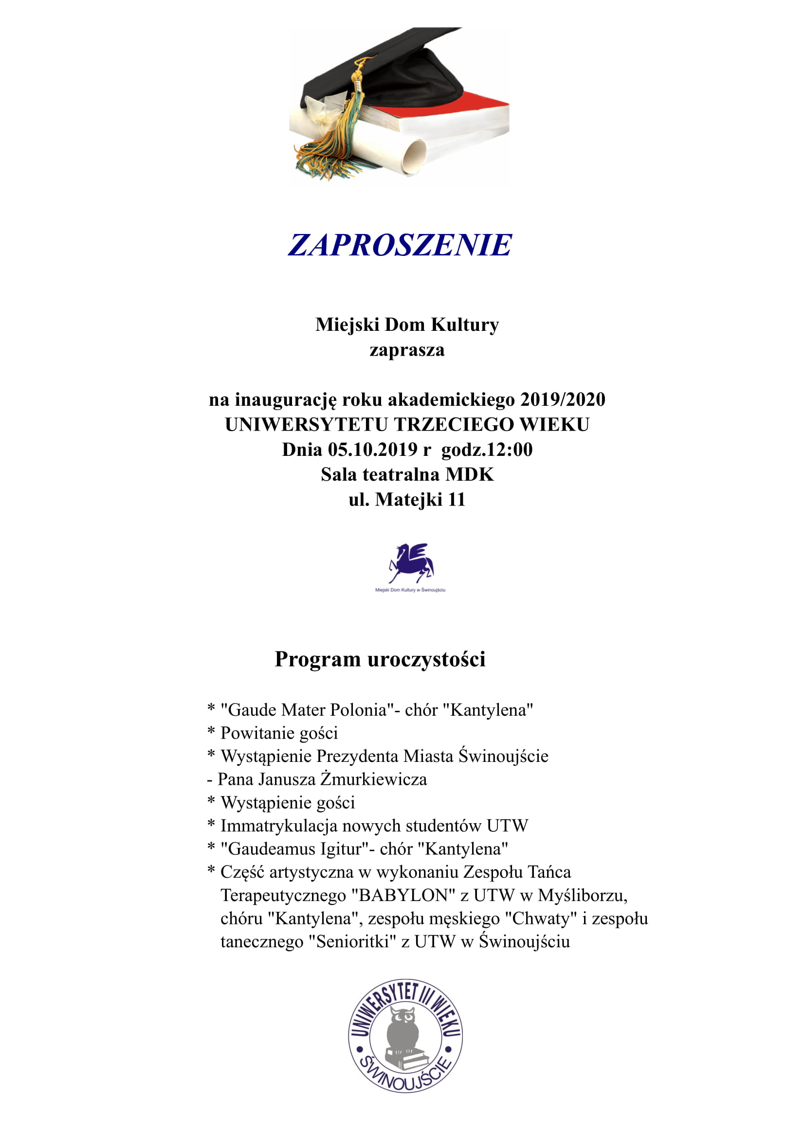Miejski Dom Kultury w Świnoujściu, Uniwersytet Trzeciego Wieku zapraszają na koncert inaugurujący nowy rok akademicki 2019/2020 " ŻYJ KOLOROWO" w dniu 4 października 2019 roku godz. 18.00 sala teatralna MDK ul. Matejki 11. Wstęp wolny