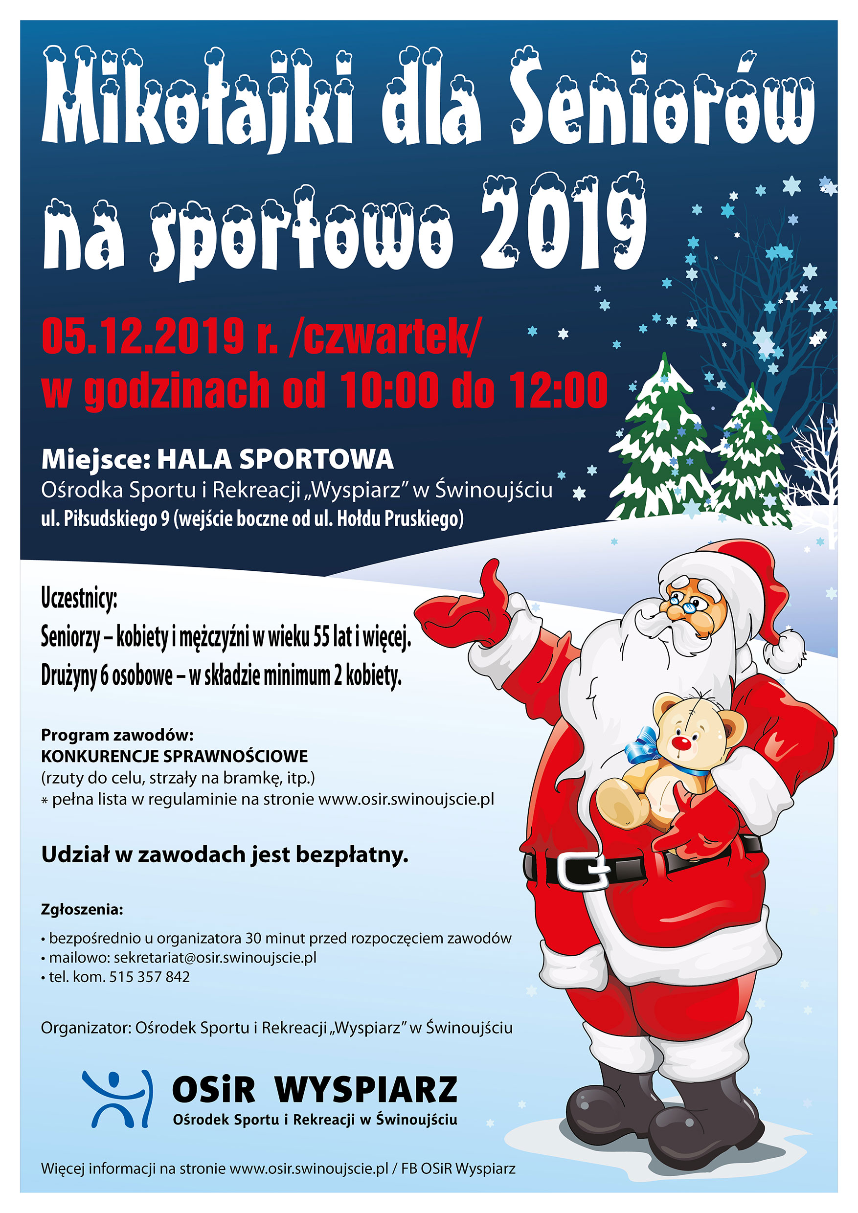 Ośrodek Sportu i Rekreacji „Wyspiarz” w Świnoujściu zaprasza osoby w wieku powyżej 55 lat do udziału w imprezie pn. „Mikołajki dla Seniorów na sportowo 2019”. Zawody odbędą się dnia 5 grudnia 2019 r. w godzinach od 10:00 do 12:00 w hali sportowej Ośrodka Sportu i Rekreacji „Wyspiarz” w Świnoujściu przy ul. Piłsudskiego 9 (wejście boczne od ul. Hołdu Pruskiego).