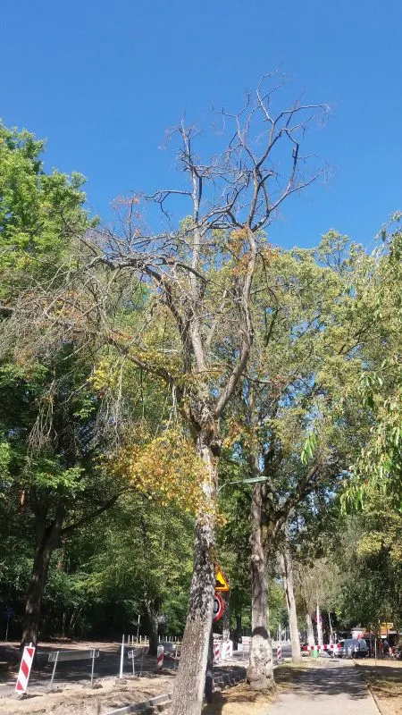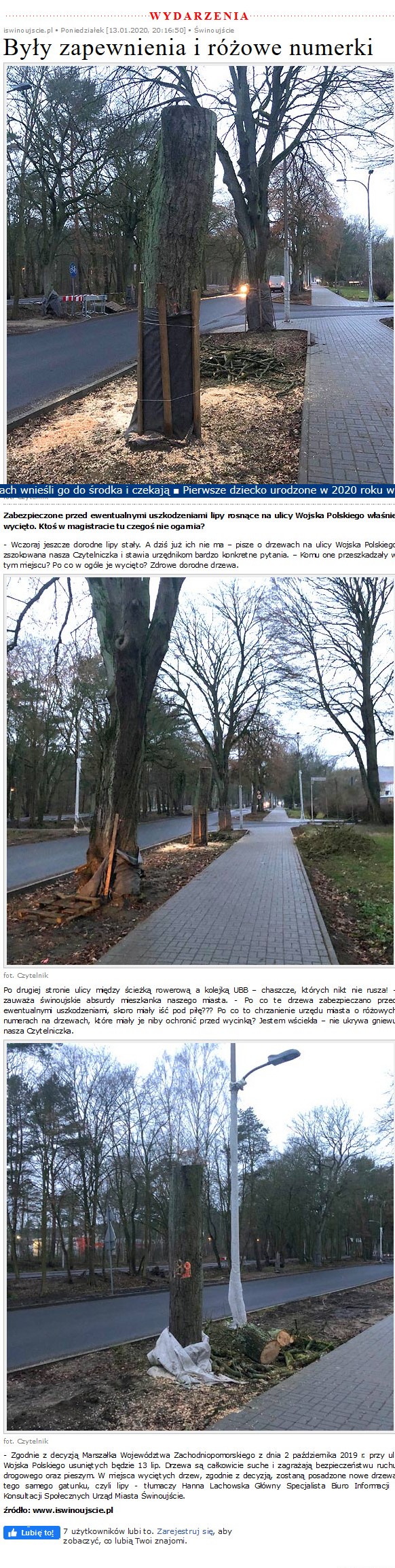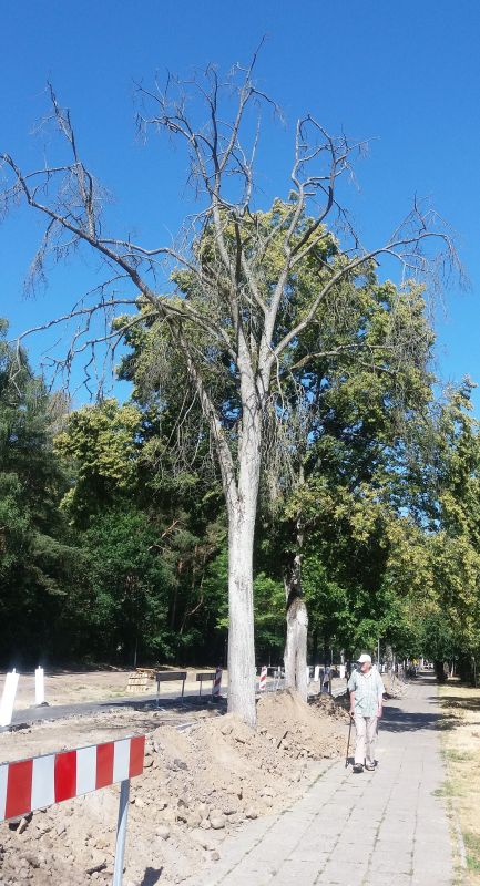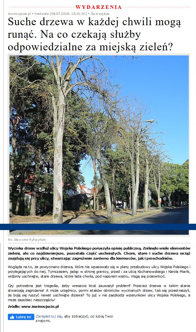 Fot. Portal, który jeszcze niedawno pisał o suchych drzewach i zarzucał urzędnikom bezczynność (zdjęcie u góry), dziś gdy drzewa są usuwane, staje w ich obronie i zarzuca urzędnikom, że wycinają zdrowe drzewa (zdjęcie poniżej).