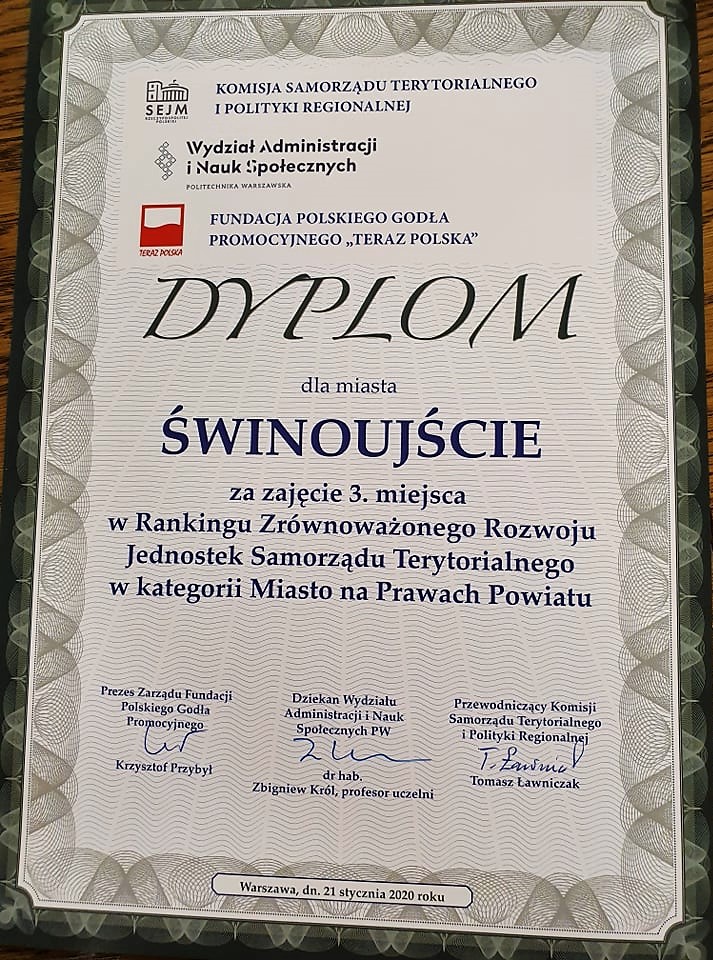 Świnoujście zajęło 3. miejsce wśród miast na prawach powiatu w Polsce o najwyższym poziomie rozwoju w XVII edycji Rankingu Zrównoważonego Rozwoju Jednostek Samorządu Terytorialnego. Jest jedynym z województwa zachodniopomorskiego, które znalazło się nie tylko w pierwszej dziesiątce, ale i dwudziestce. Kolejnym jest dopiero Szczecin z 21. pozycją w rankingu. Oceniano wszystkie 66 miasta na prawach powiatu w Polsce.