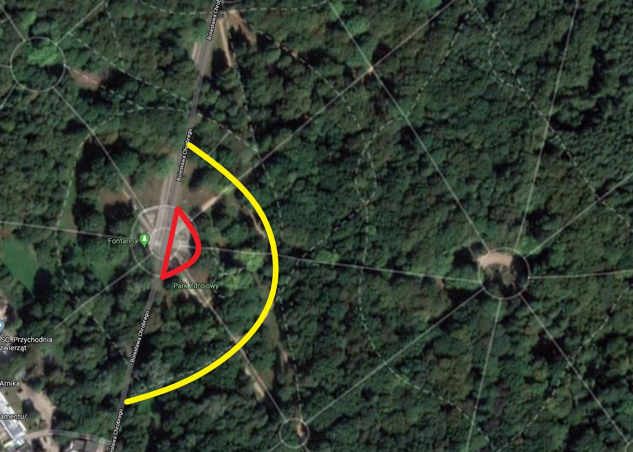 Na mapce: na czerwono zaznaczony jest obszar wyłączony z powodu prowadzenia robót, a na żółto proponowana trasa obejścia.