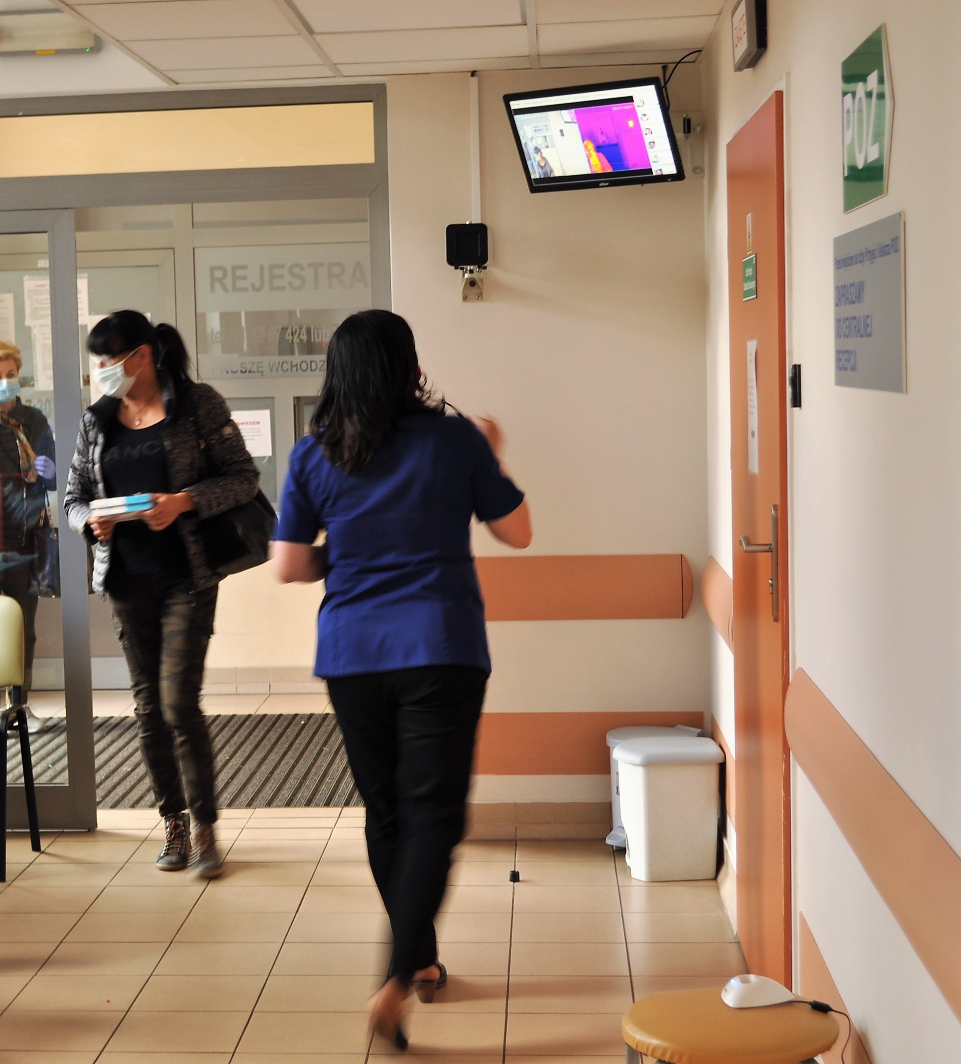 Szpital miejski. Termowizyjna kamera mierzy temperaturę wchodzącym.