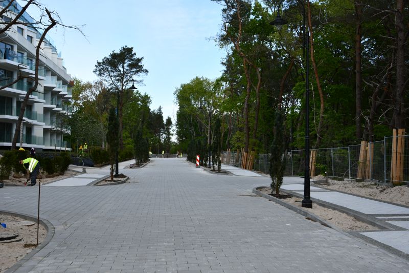 Plażowicze już niedługo będą mogli korzystać z kolejnego wygodnego zejścia na plażę. Wykonano już większość nawierzchni jezdni i chodników przy powstającym przedłużeniu ulicy Zdrojowej. Równolegle postępują prace przy zejściu na plażę, które nabiera coraz wyraźniejszych kształtów. Przy chodnikach wykonano nasadzenia zieleni – sosnę kolumnową, cisy, wydmuchrzycę. Trwają prace przy murze oporowym z gabionów. Wykonawca deklaruje zakończenie prac do końca maja.