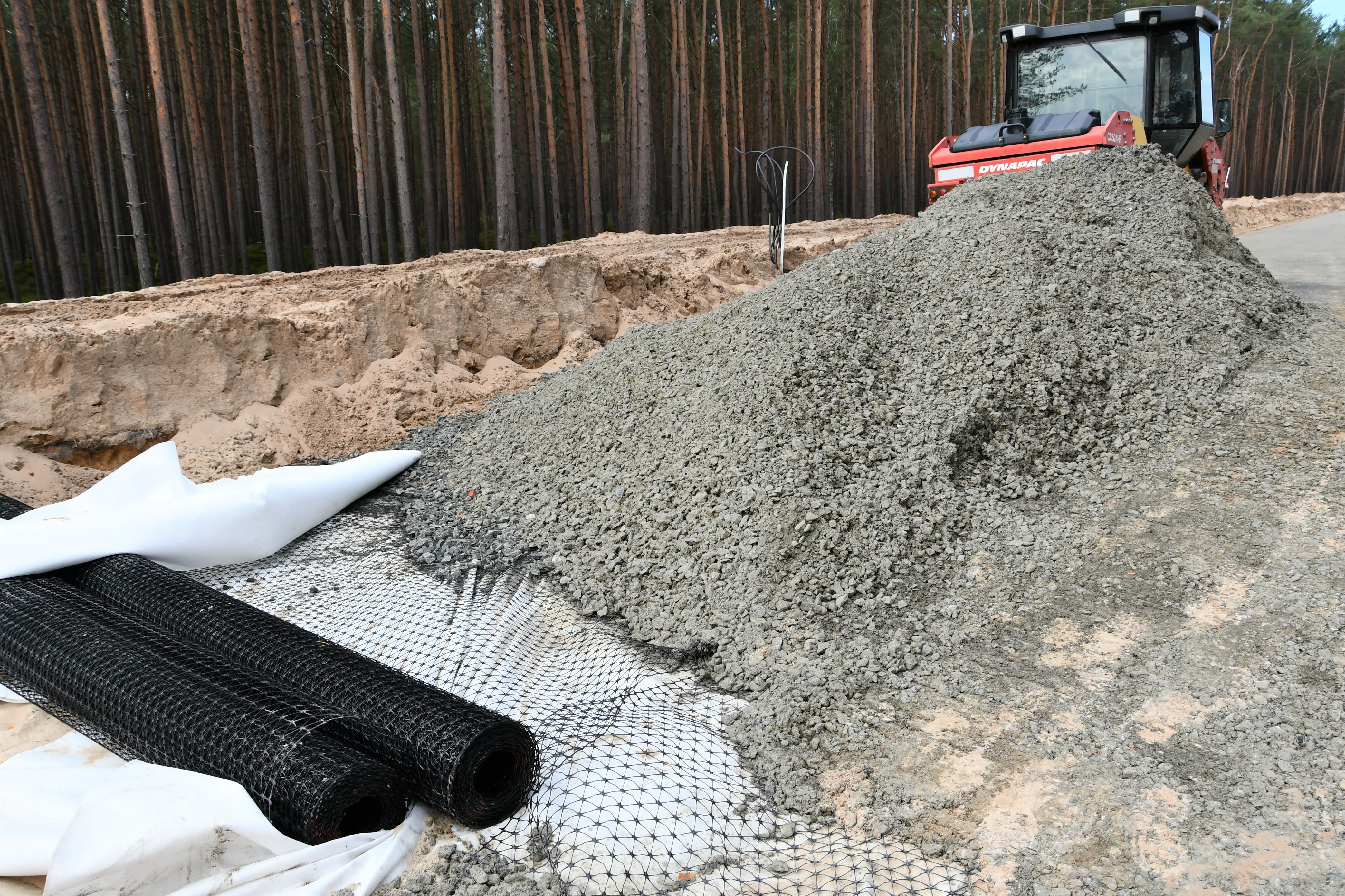 Na zdjęciu kruszywo i georuszt (czarne rolki), które wykorzystywane są