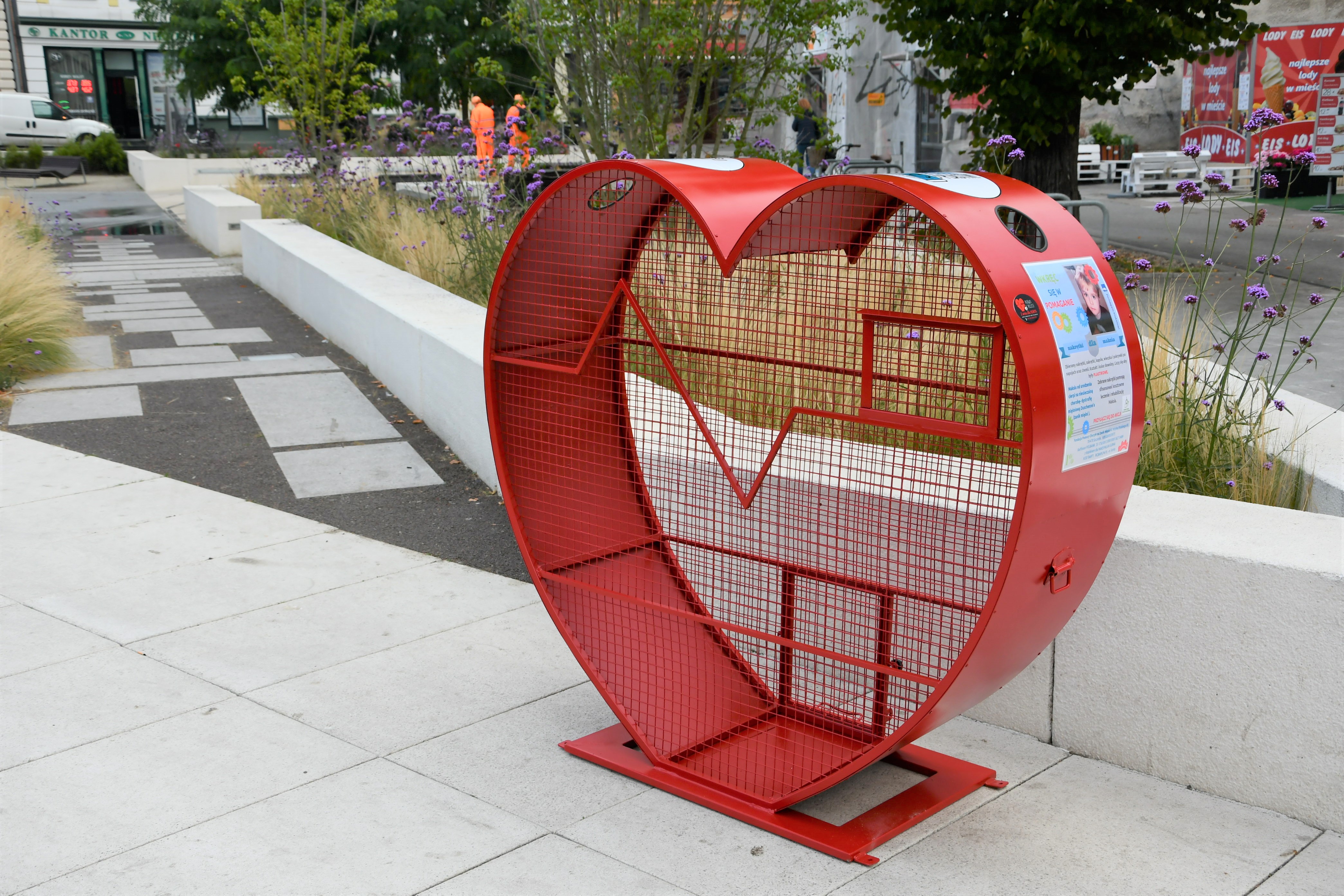 Na zdjęciu czerwony koszt w kształcie serca, do którego na placu Wolności