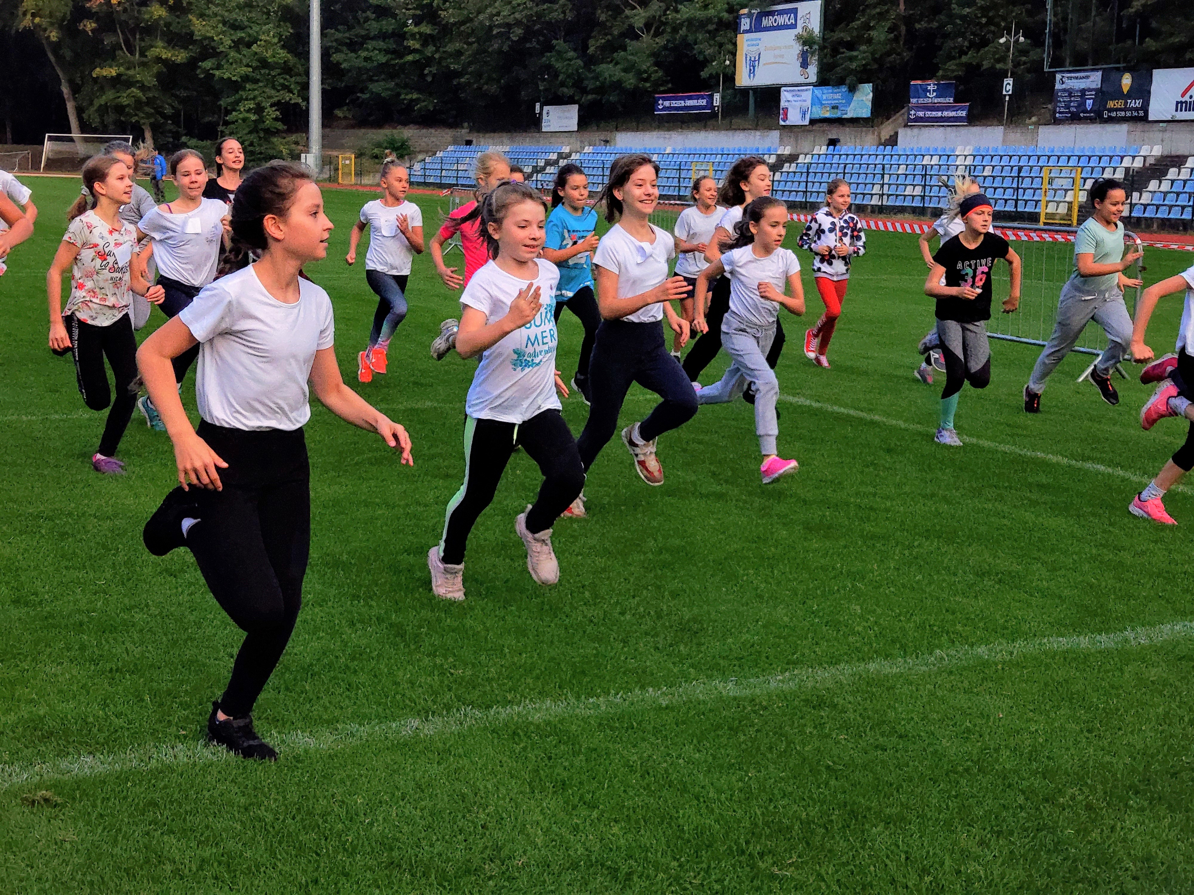 Na zdjęciu dziewczęta biegające po murawie boiska.