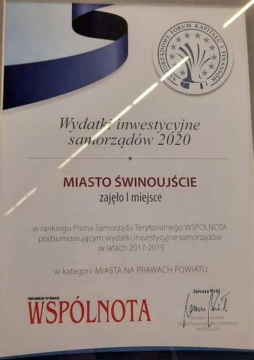 W rankingu obejmującym lata 2017-2019 średnie wydatki inwestycyjne w Świnoujściu wyniosły 3600 zł per capita (na osobę). To o ponad 1200 zł więcej niż kolejne miasto w rankingu, czyli Krosno z wydatkami 2397 zł na osobę. Trzecie miejsce zajął Konin, a dopiero za nim uplasowały się Gliwice. W 2017 roku Świnoujście przeznaczało na inwestycje 50 mln zł rocznie. Rok później zaplanowana na inwestycje kwota wzrosła do ponad 200 mln zł, zaś w 2019 roku było to ponad 321 mln zł.