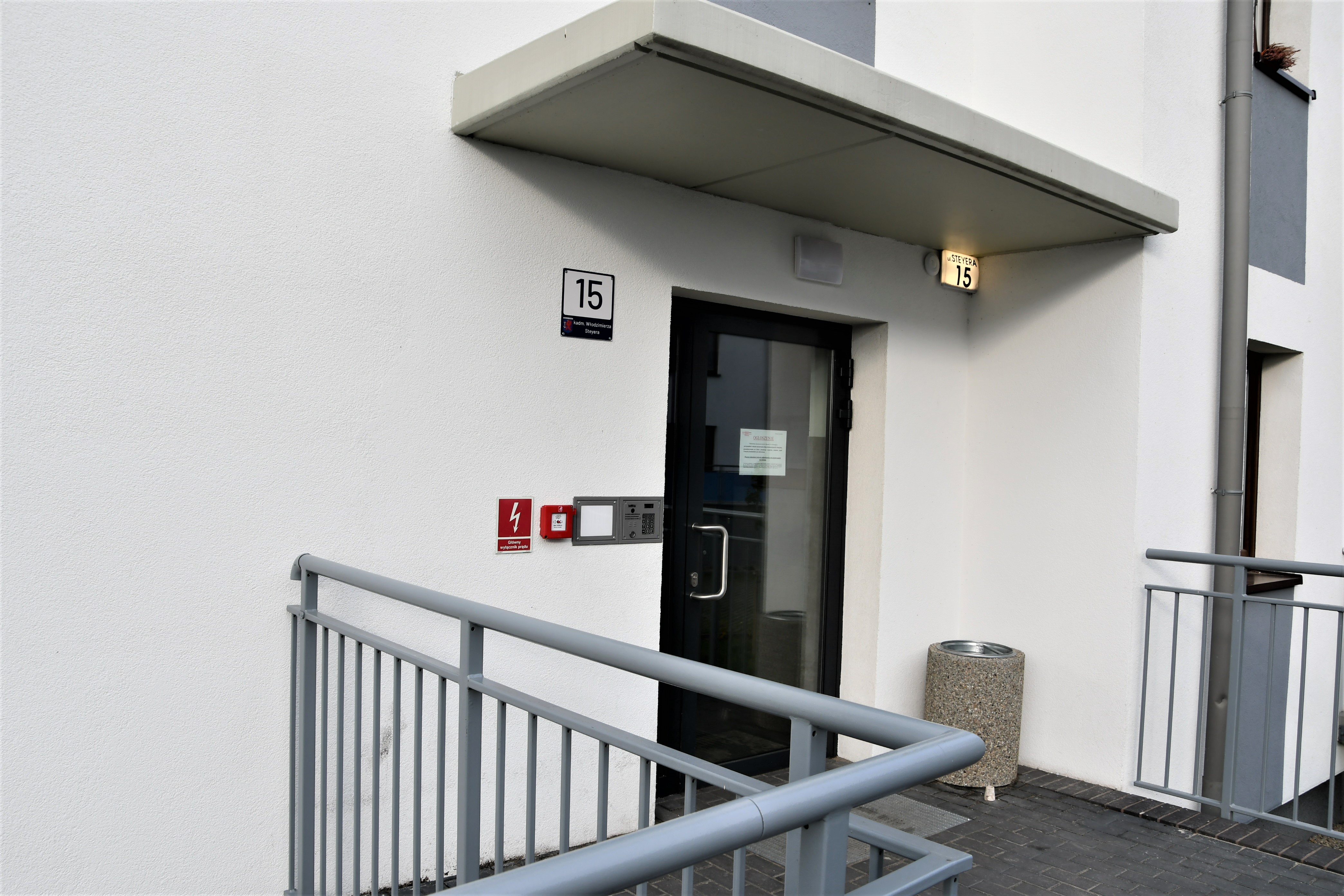 Wejście do klatki schodowej przy ul. Steyera, obok tablica adresowa wg nowego wzoru