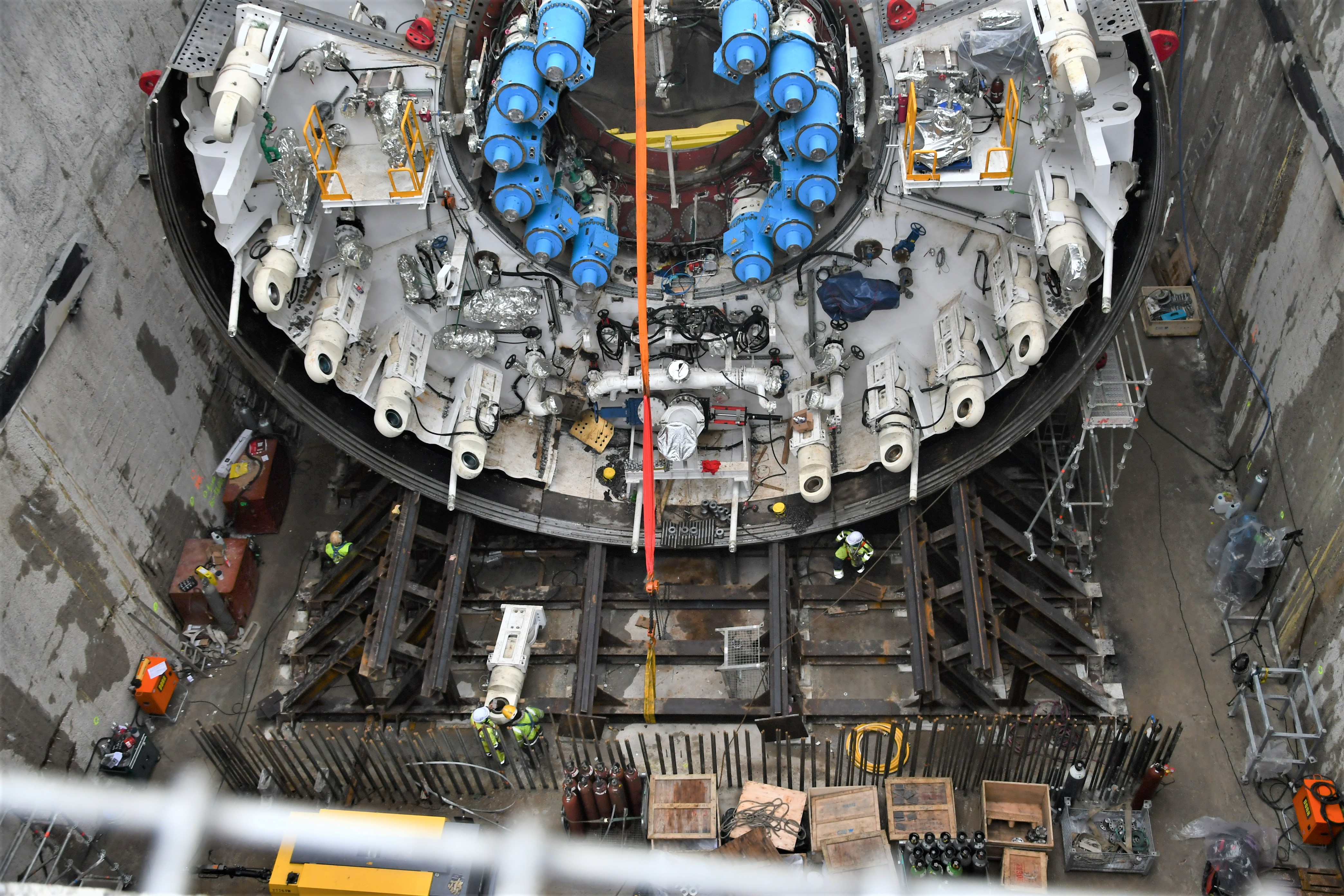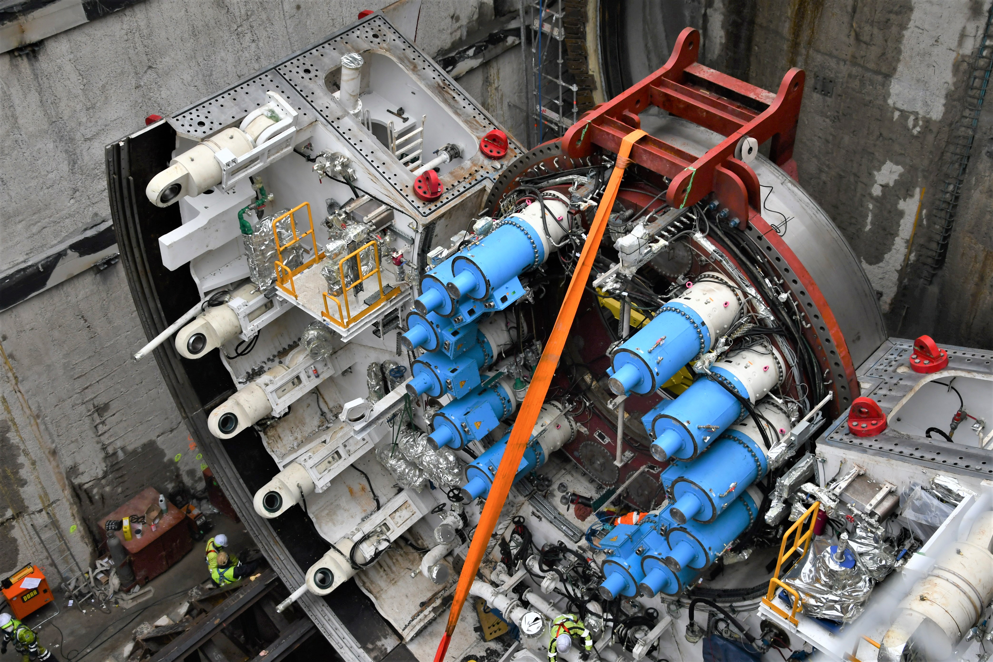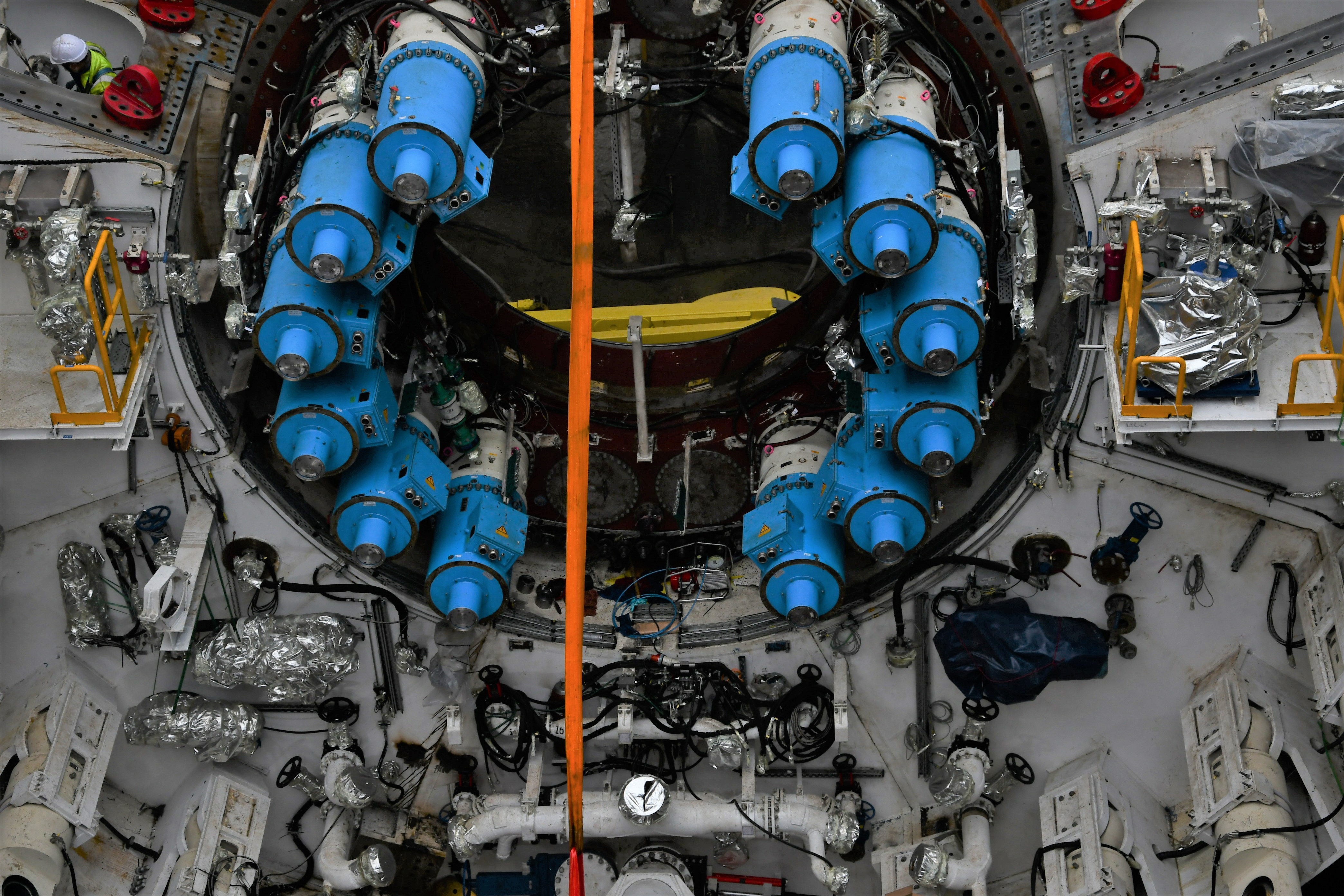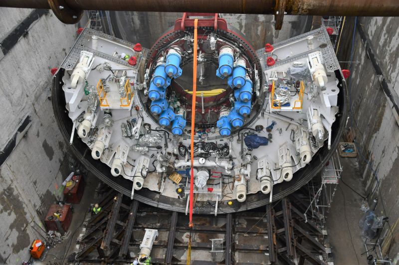 W ubiegłym tygodniu w komorze startowej (gdzie maszyna rozpocznie drążenie) zamontowano tor stalowy dla bram maszyny TBM oraz kluczową część TBM, czyli łożysko z napędem. Montaż elementów „wielkiego kreta” odbywał się także na powierzchni, przy szybie startowym. Elementy są opuszczane przez dwa gigantyczne dźwigi o nośności 650 ton każdy.