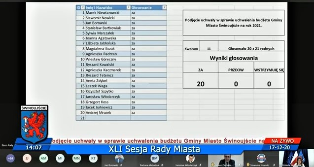 Fot. Sesja, podobnie jak wcześniejsze odbyła się w systemie zdalnym. Na zdjęciu wynik głosowania nad projektem budżetu na 2021 rok.