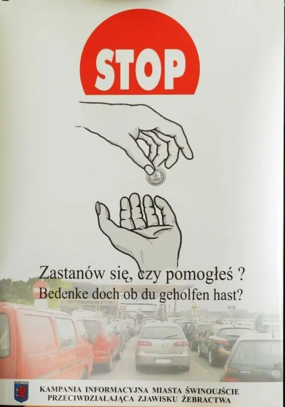 Na plakacie jest duży czerwony znak „stop”, pod nim dwie dłonie. Jedna dająca monetę, a druga wyciągająca po nią rękę. Pod nimi napis w dwóch językach „zastanów się, czy pomogłeś?”. Tłem jest zdjęcie samochodów oczekujących na przeprawę promową.