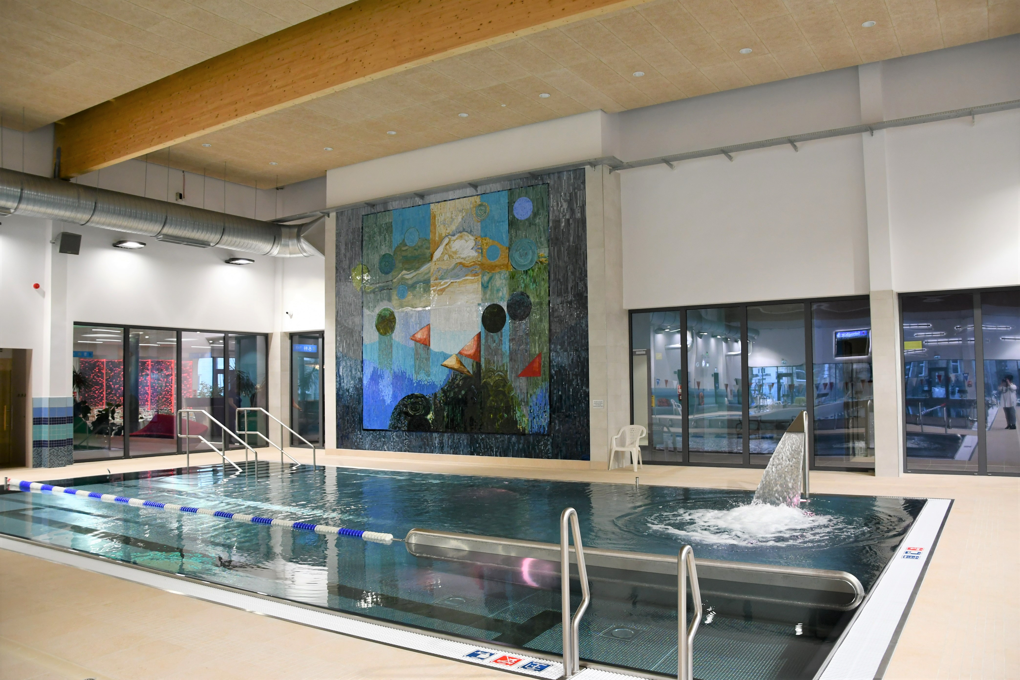 Na zdjęciu mała niecka basenu, w tle element aranżacji - szklana mozaika wykonana na podstawie obrazu świnoujskiego artysty.