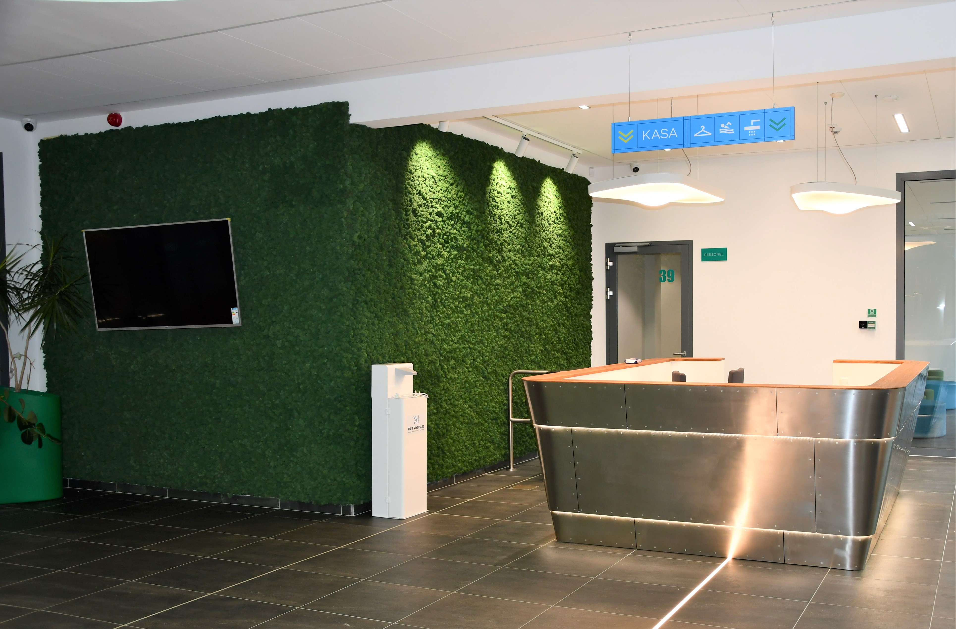 Na zdjęciu ściana w holu oklejona naturalnym mchem. Po prawej lada z kasami.