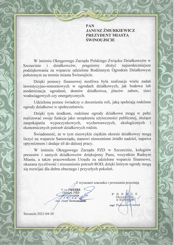 - Pomoc, jaką udzieliło miasto świadczy o docenieniu roli, jaką spełniają rodzinne ogrody działkowe w społeczeństwie - napisali w podziękowaniu Tadeusz Jarzębak i Józef Romanowski z zarządu Okręgu Polskiego Związku Działkowców w Szczecinie. - Świadomość, że w tym niezwykle ciężkim okresie działkowcy mogą liczyć na wsparcie samorządu, stanowi nieocenione źródło nadziei, napawa optymizmem i dodaje sił do dalszej pracy.