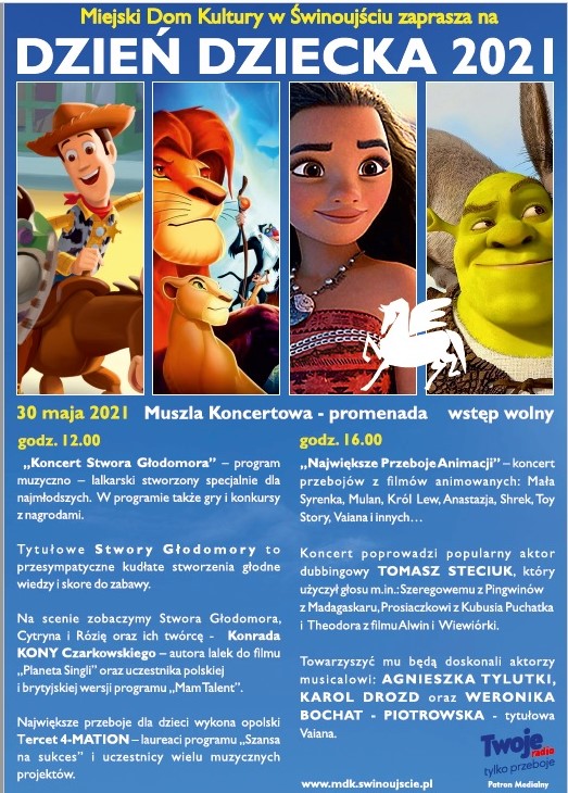 O godzinie 16, także w muszli koncertowej rozpocznie się koncert największych przebojów filmów animowanych. Koncert poprowadzi popularny aktor dubbingowy Tomasz Steciuk. To jego głosem mówią m.in. Szeregowy z „Pingwinów z Madagaskaru”, Prosiaczek z „Kubusia Puchatka” i Theodor z „Alwin i wiewiórki”. Towarzyszyć mu będą aktorzy musicalowi Weronika Bochat – Piotrowska oraz Agnieszka Tylutki i Karol Drozd.
