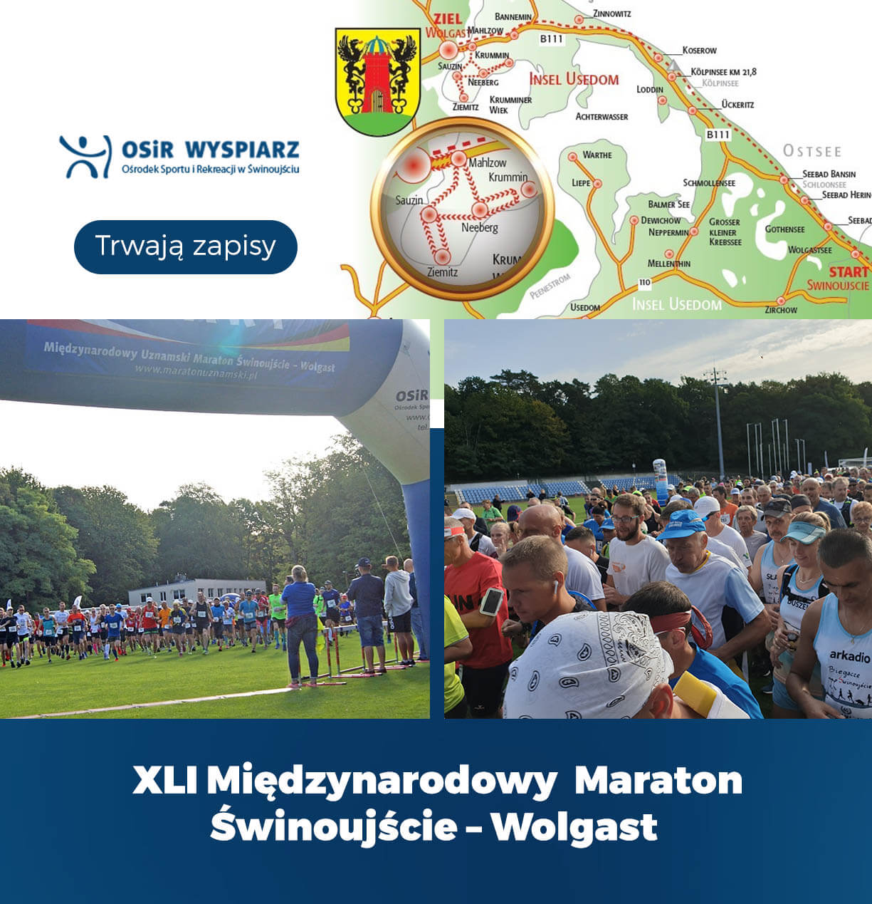Trwają zapisy elektroniczne na XLI Międzynarodowy Maraton Świnoujście – Wolgast, 30 Półmaraton Wolgast oraz V Sztafetę Świnoujście - Wolgast. Tegoroczny Maraton odbędzie się w sobotę 4 września 2021 r. Start Maratonu Świnoujście – Wolgast oraz sztafety odbędzie się o godzinie 9:30 ze Stadionu Miejskiego przy ul. Matejki 22. Meta znajduje się na stadionie Wolgast Peene. Start Półmaratonu odbędzie się ze stadionu Wolgast Peene o godzinie 9:30, meta znajduje się na stadionie Wolgast Peene.