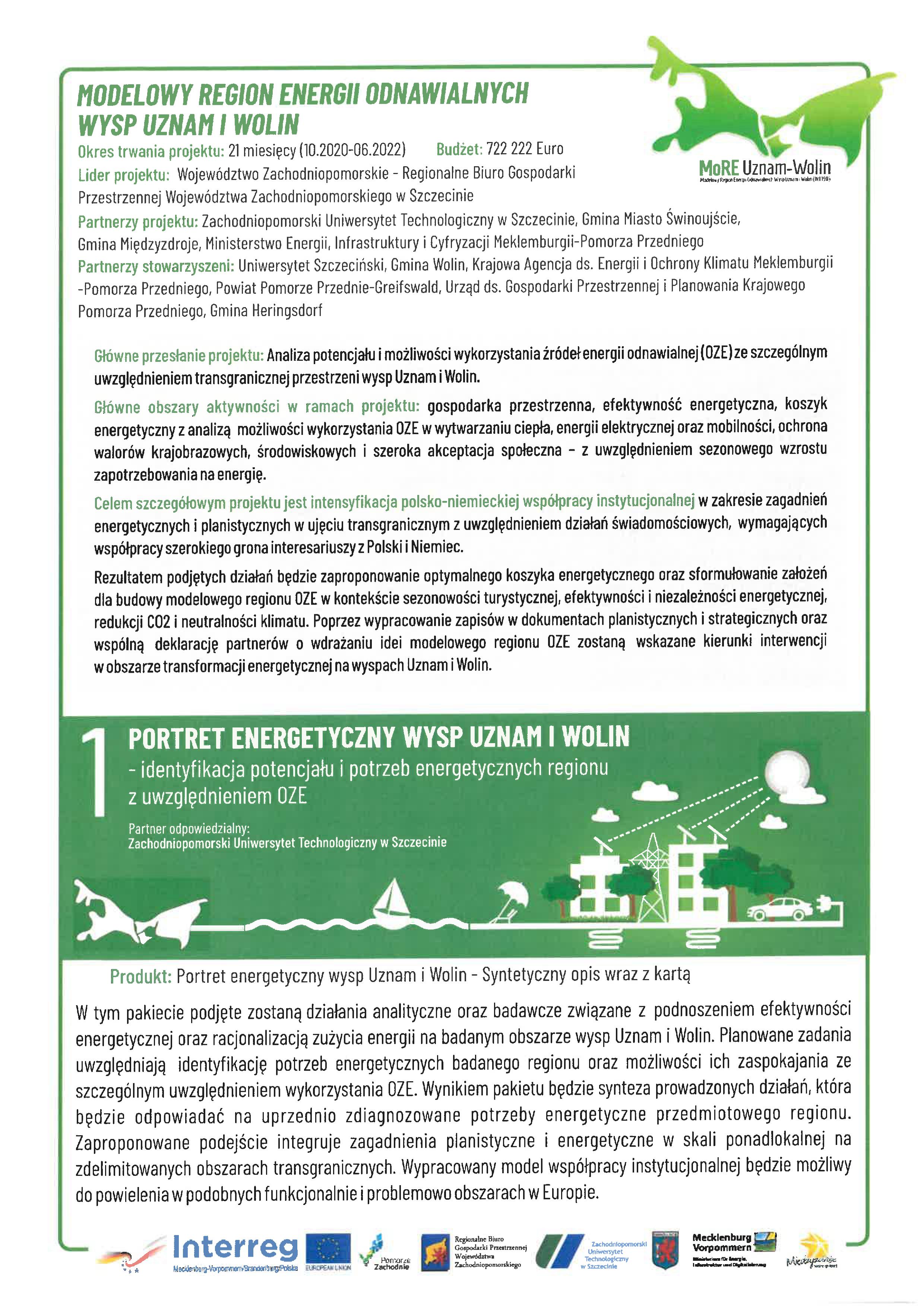 Projekt MoRE Uznam Wolin jest realizowany w części polskiej i niemieckiej wysp Uznam i Wolin. Dotyczy zagadnień energetycznych i planistycznych w ujęciu transgranicznym z uwzględnieniem działań świadomościowych, wymagających współpracy polsko-niemieckiego grona interesariuszy tj.: mieszkańców, szkół, jednostek samorządowych, instytucji naukowych, branży turystycznej, usług i gospodarki komunalnej, mobilności oraz jednostek planistycznych, właścicieli i dysponentów infrastruktury energetycznej. Projekt zmierza do zainicjowania przemian w obszarze energetyki i ekologii Wysp Uznam i Wolin, a jego docelowym, długoterminowym beneficjentem będą mieszkańcy wysp oraz terenów sąsiednich.