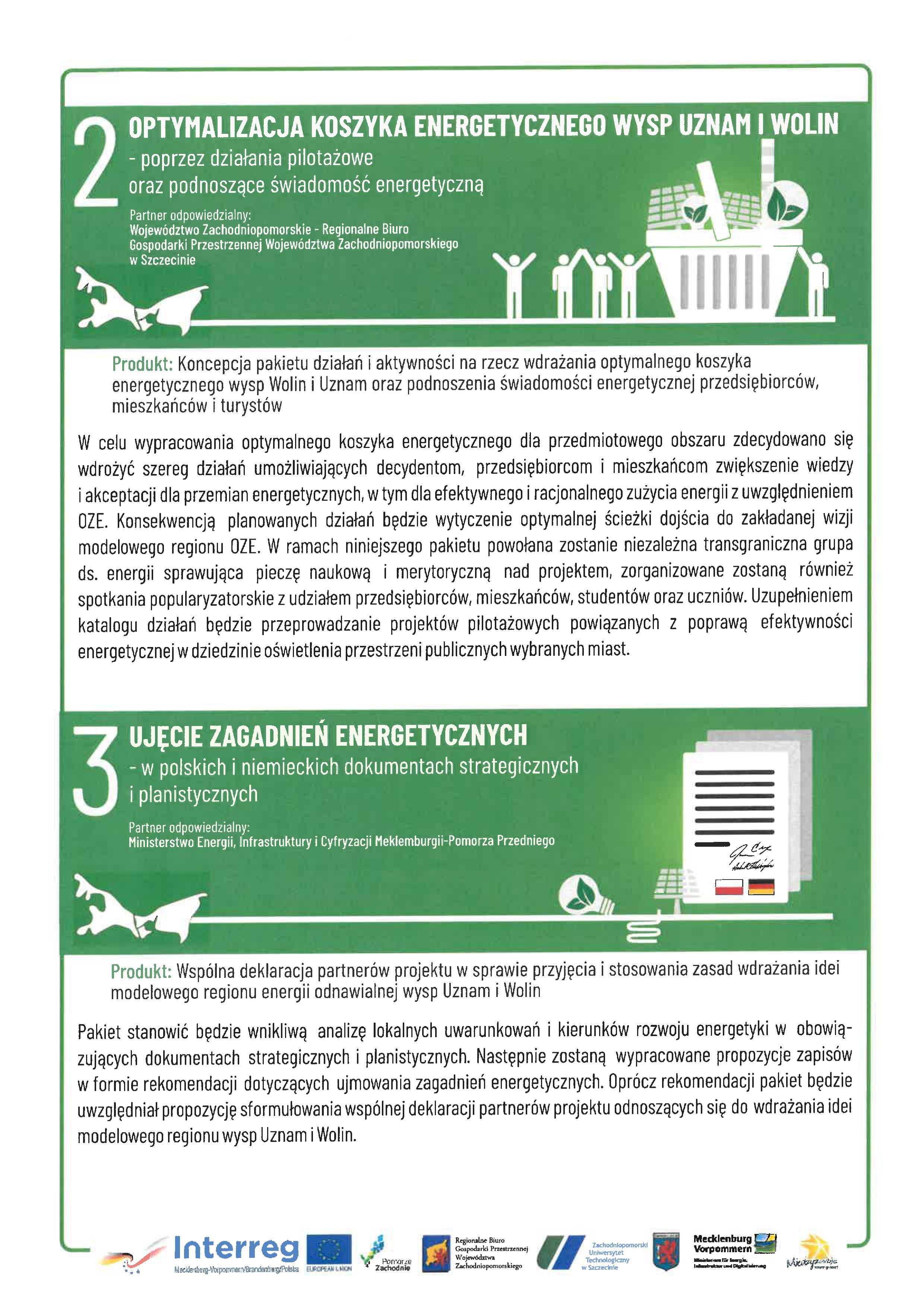 Celem projektu jest intensyfikacja polsko-niemieckiej współpracy instytucjonalnej pn. „Modelowy Region Energii Odnawialnych Wysp Uznam i Wolin”. Rezultatem będzie zaproponowanie optymalnego koszyka energetycznego oraz sformułowanie założeń dla budowy modelowego regionu OZE w kontekście sezonowości turystycznej, efektywności i niezależności energetycznej, redukcji CO2 i neutralności klimatu. Poprzez wypracowanie zapisów dotyczących energii w dokumentach planistycznych i strategicznych oraz wspólną deklarację partnerów o wdrażaniu idei modelowego regionu OZE zostaną wskazane kierunki interwencji w obszarze transformacji energetycznej na wyspach Uznam i Wolin.