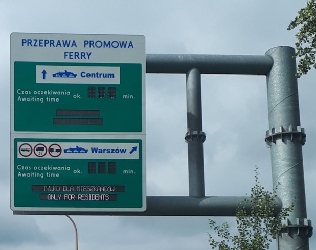 Tablica informująca o czasie oczekiwania na przeprawę promową w Świnoujściu.