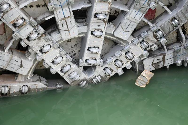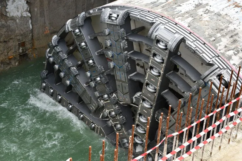 Zanim Wyspiarka weszła do szybu odbiorczego zatrzymała się tuż przed betonową ścianą szczelinową. Komora robocza maszyny przeszła jeszcze inspekcję. A w maszynie sprawdzono stan narzędzi tnących oraz urabiających. Przewiercenie się przez ścianę szczelinową było nie lada wyzwaniem – to blok o grubości 16 metrów.