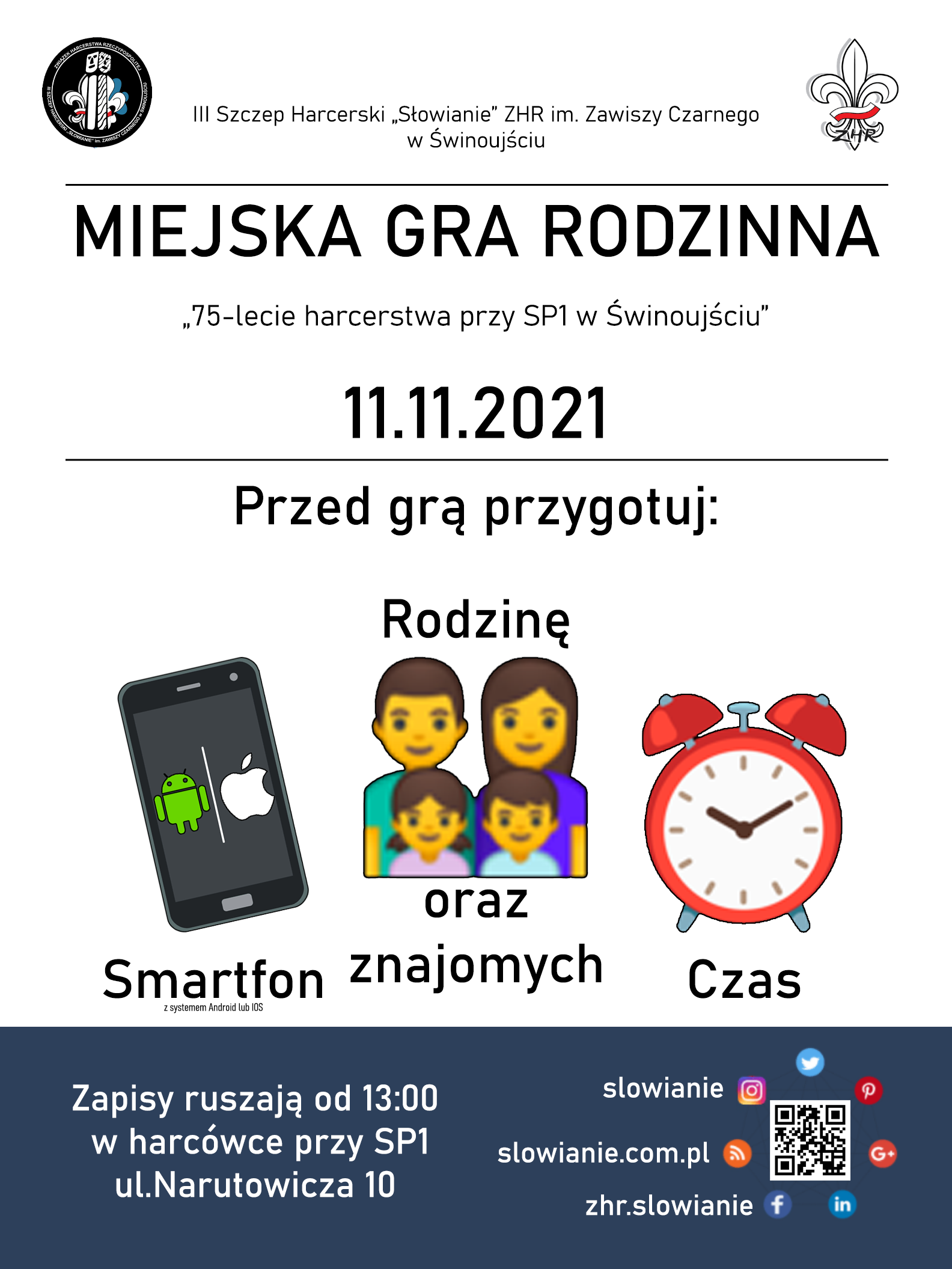 11.11.2021 zapraszamy do udziału w grze terenowej „75-lecie harcerstwa przy SP1 w Świnoujściu” organizowanej przez Harcerzy i Harcerki z III Szczepu Harcerskiego „Słowianie” ZHR im. Zawiszy Czarnego w Świnoujściu dla mieszkańców i gości miasta Świnoujście.