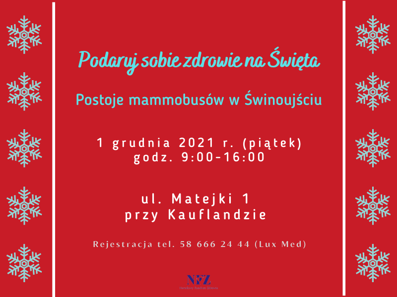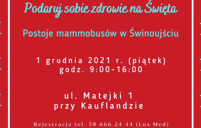 Poniżej wykaz postojów mammobusów w Świnoujściu w grudniu: 01.12, Świnoujście, ul. Matejki 1, przy Kauflandzie, godz. 9-16, Lux Med
