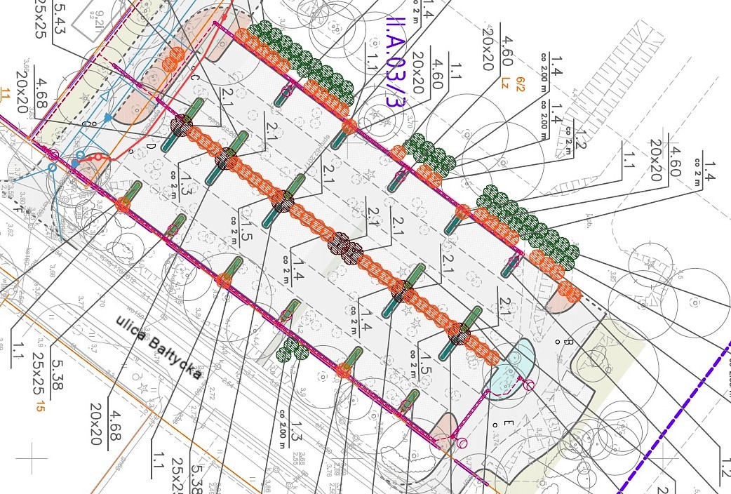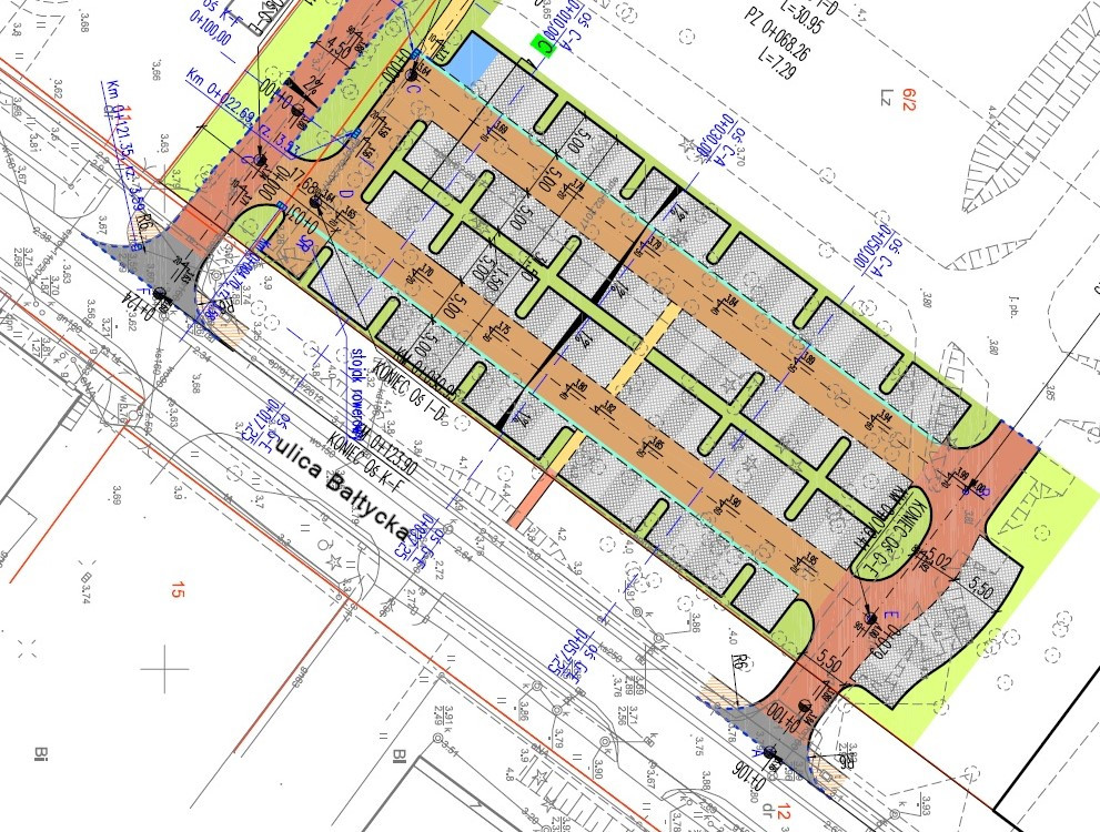 Na zdjęciu nowy parking; na zielono i pomarańczowo zaznaczono nasadzenia zieleni, w tym nowych drzew.