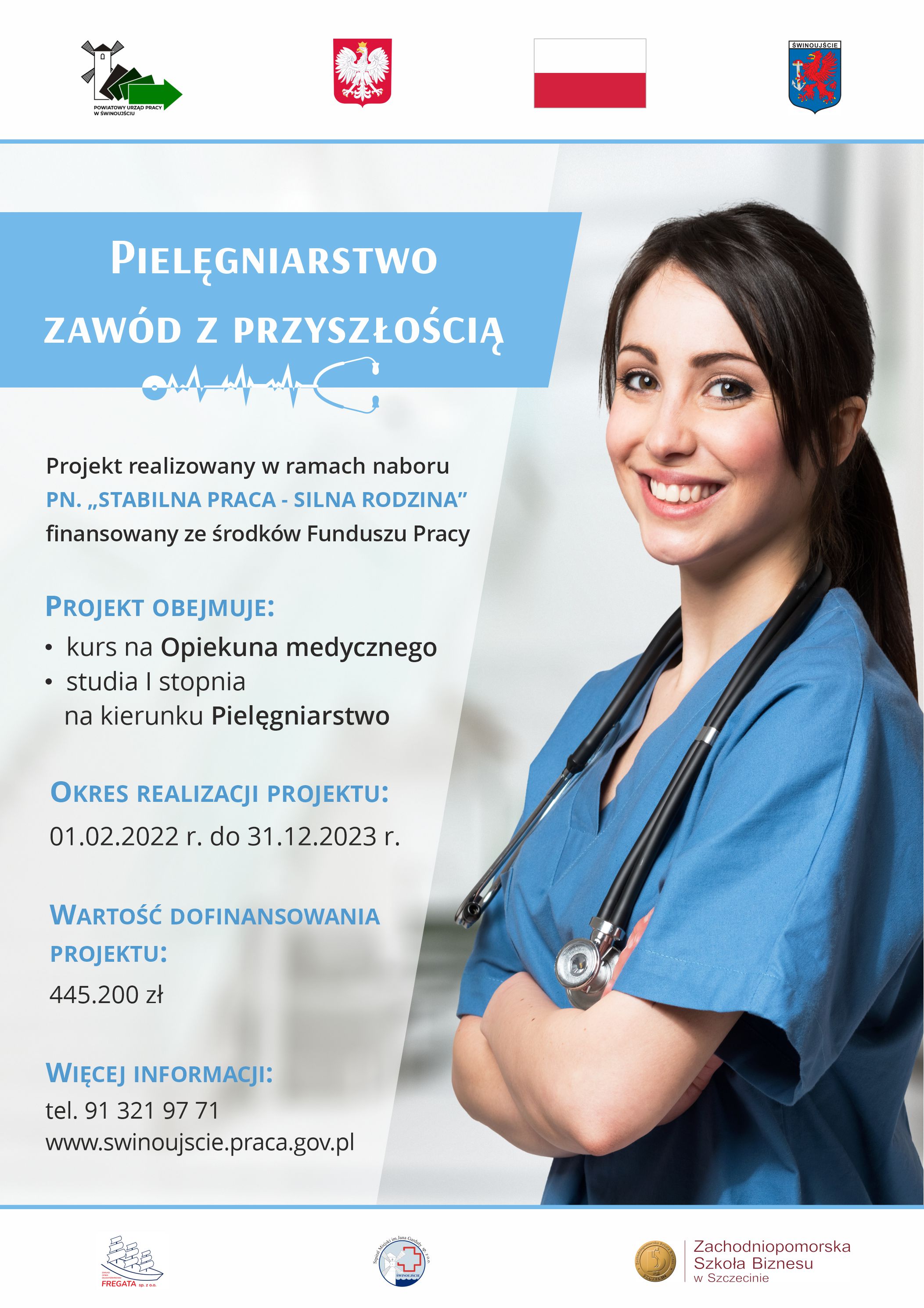 Program „Pielęgniarstwo – zawód z przyszłością” realizowany będzie w Gminie Miasto Świnoujście. Powiatowy Urząd Pracy w Świnoujściu planuje objąć wsparciem 20 osób bezrobotnych bądź poszukujących pracy. Każdy z uczestników otrzyma wsparcie w wysokości 20.800 zł na poszerzenie swoich kwalifikacji w zakresie: