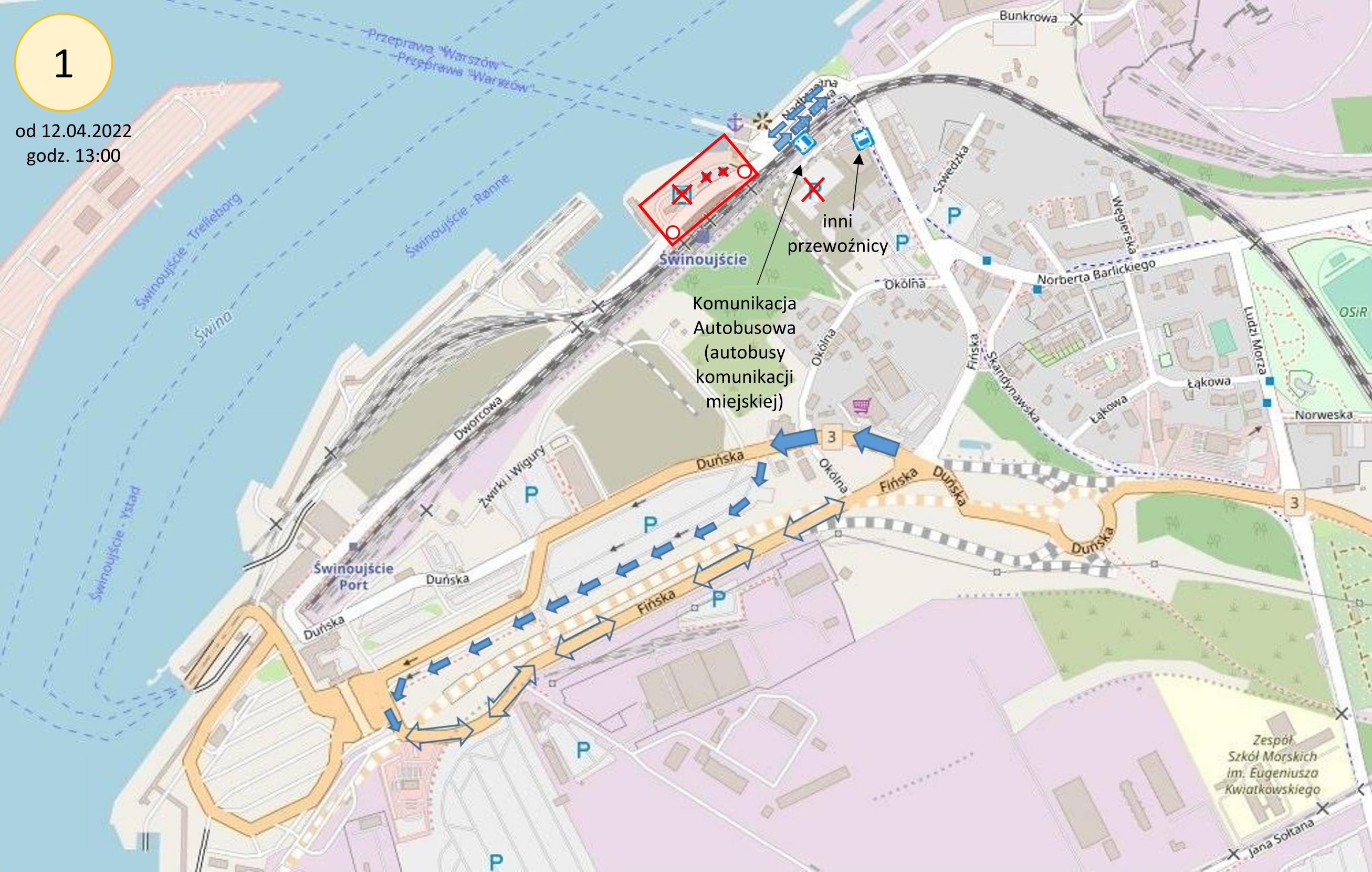 Na ulicy Nadbrzeżnej pas ruchu przeznaczony dotychczas dla pojazdów z pierwszeństwem wjazdu na prom dostępny będzie tymczasowo do przejazdu na ulicę Dworcową (tzn. zawrócenia w stronę ulicy Barlickiego) dla wszystkich pojazdów.