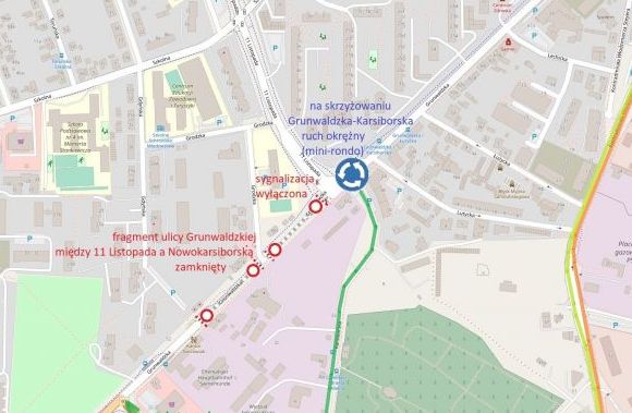 Na skrzyżowaniu Grunwaldzka-Karsiborska następnie wprowadzony zostanie tymczasowo ruch okrężny w formie mini-ronda.