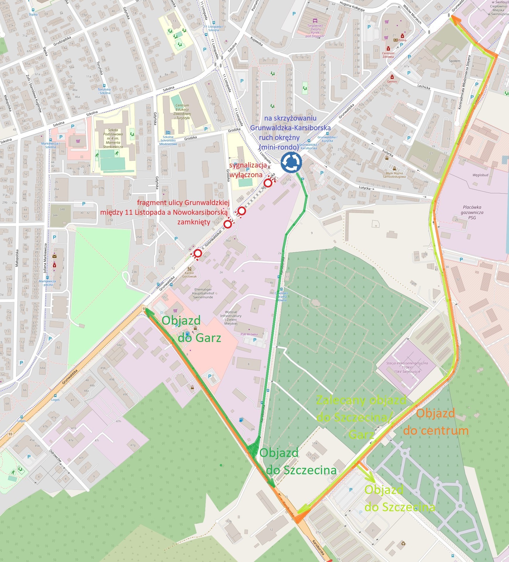 W związku z nadchodzącym, sezonowym wzrostem natężenia ruchu na drogach oraz kontynuacją zamknięcia odcinka ulicy Grunwaldzkiej między ulicami Nowokarsiborską a 11 Listopada i zakończonymi pracami w ramach budowy wschodniej obwodnicy, objazd zamkniętego fragmentu ulicy Grunwaldzkiej w kierunku centrum wkrótce przekierowany zostanie na wschodnią obwodnicę, tzn. na ulicę Steyera.