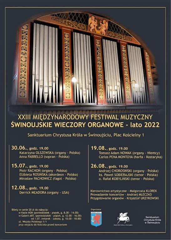 19.08., godz. 19.00 Koncert Tomasza Adama Nowaka (organy/Niemcy) i Carlosa Pena Montoya (harfa/Kostaryka) w ramach XXXIII Międzynarodowego Festiwalu Muzycznego „Świnoujskie Wieczory Organowe – lato 2022”, Sanktuarium Chrystusa Króla, Plac Kościelny 1, impreza biletowana