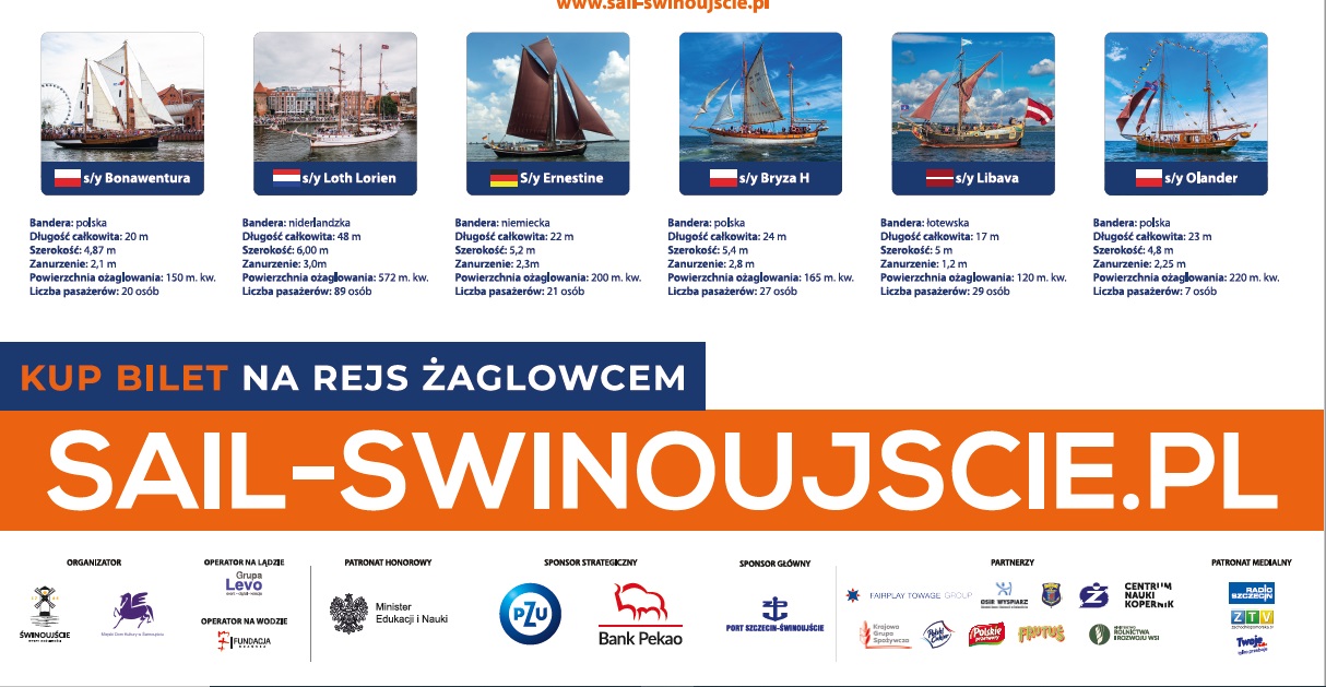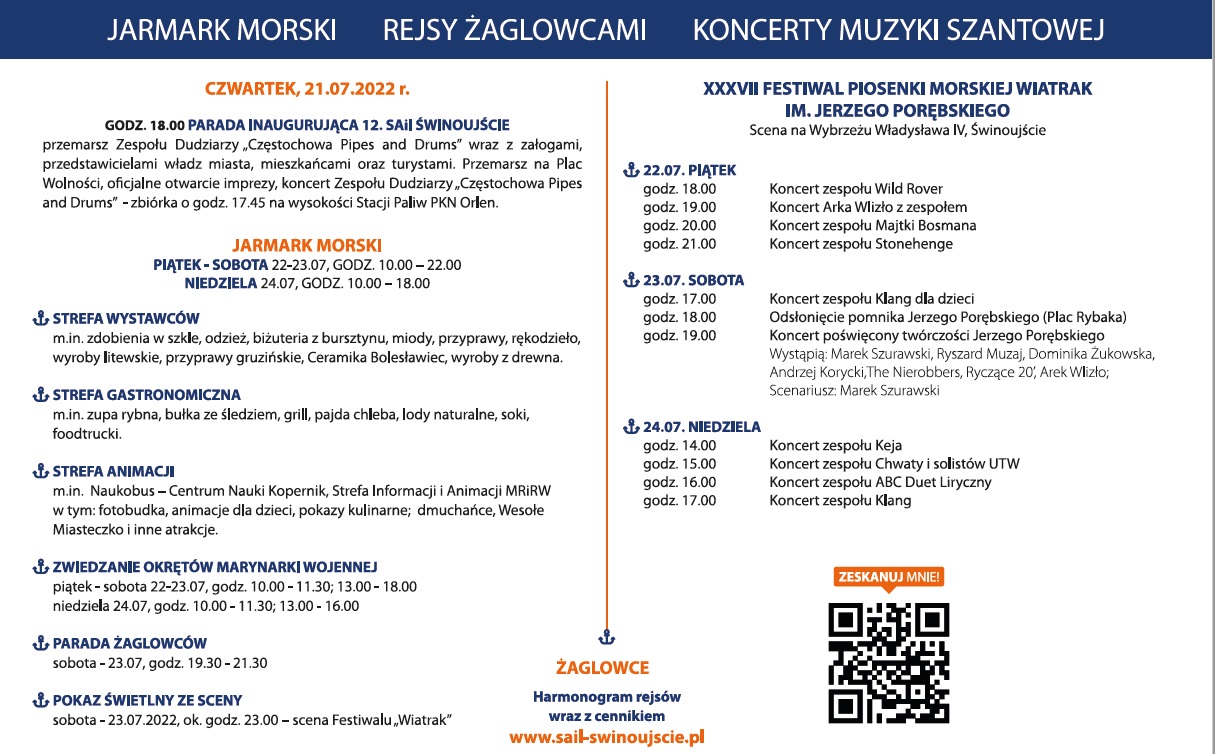 Z radością informujemy, że w tym roku w dniach 22-24 lipca na nabrzeżu przy ul. Wybrzeże Władysława IV na wysokości Kapitanatu Portu odbędą już dwunasta edycja Sail Świnoujście oraz XXXVII Festiwal Piosenki Morskiej „Wiatrak”im. Jerzego Porębskiego. W programie m.in. rejsy żaglowcami na pełne morze, jarmark morski (strefa wystawców, strefa gastronomiczna i strefa animacji), koncerty muzyki szantowej, zwiedzanie Okrętów Marynarki Wojennej i wiele, wiele innych!