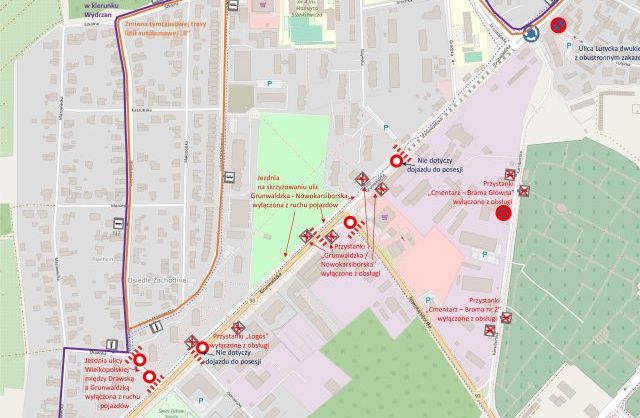 Wyłączone z ruchu będzie skrzyżowanie ulic Grunwaldzka-Nowokarsiborska oraz odcinek ulicy Wielkopolskiej między ulicą Drawską a ulicą Grunwaldzką. Objazd poprowadzony będzie przez ulice Mazowiecką, Drawską, Markiewicza/Wielkopolską i Szkolną.