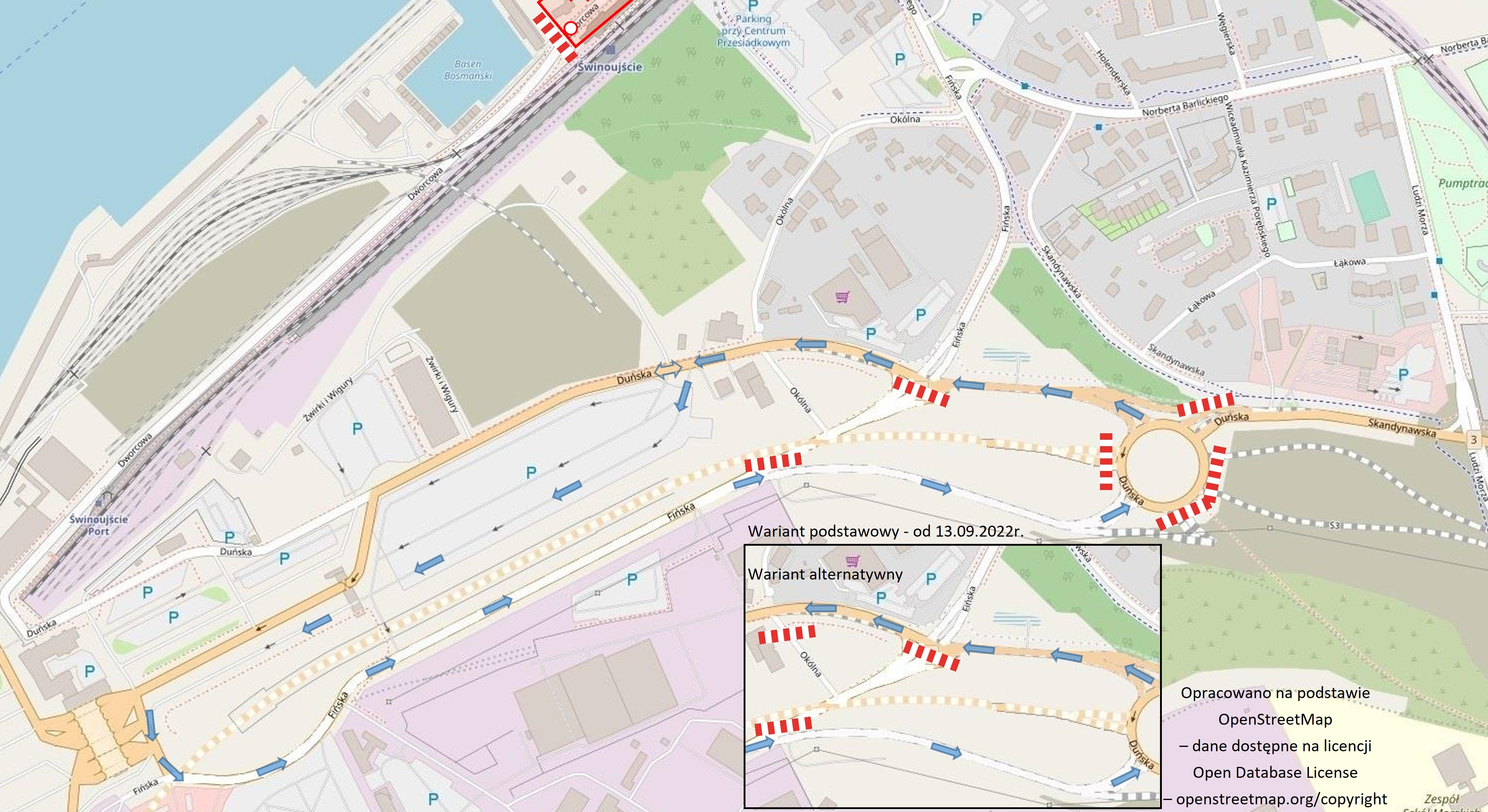 Przywrócony zostanie dwukierunkowy ruch na północnym fragmencie ulicy Fińskiej, tj. odcinku pomiędzy ulicą Duńską a ulicą Barlickiego, przy czym na skrzyżowaniu Fińska-Duńska z ulicy Fińskiej będzie można wyłącznie skręcić w prawo w ulicę Duńską w kierunku terminala promów morskich. Zatem do przeprawy promowej „Warszów” dojazd będzie możliwy z ulicy Wolińskiej ulicą Skandynawską, Duńską, Fińską i Barlickiego, natomiast dojazd z tych promów miejskich do ulicy Wolińskiej nadal odbywał się będzie objazdem, który wyznaczony będzie ulicami Barlickiego i Ludzi Morza.