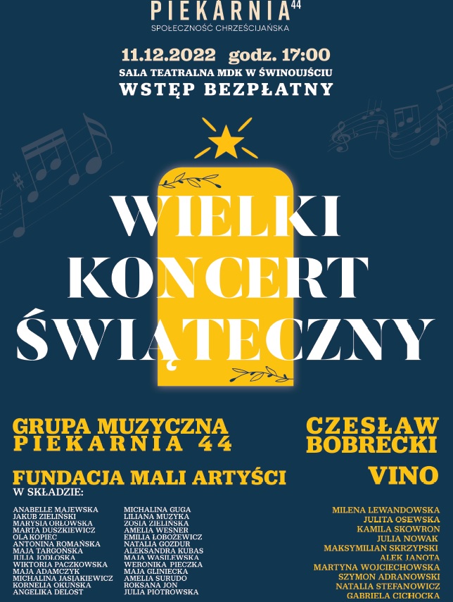 Serdecznie zapraszamy Was na „Wielki Koncert Świąteczny” organizowany przez Społeczność Chrześcijańską „Piekarnia 44”, który odbędzie się w niedzielę 11 grudnia o godz. 17:00 w sali teatralnej MDK.