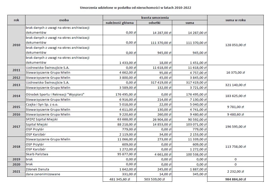 Umorzenia udzielone w podatku od nieruchomości w latach 2010-2022 wyniosły 984.884,60 zł (w tym należność główna