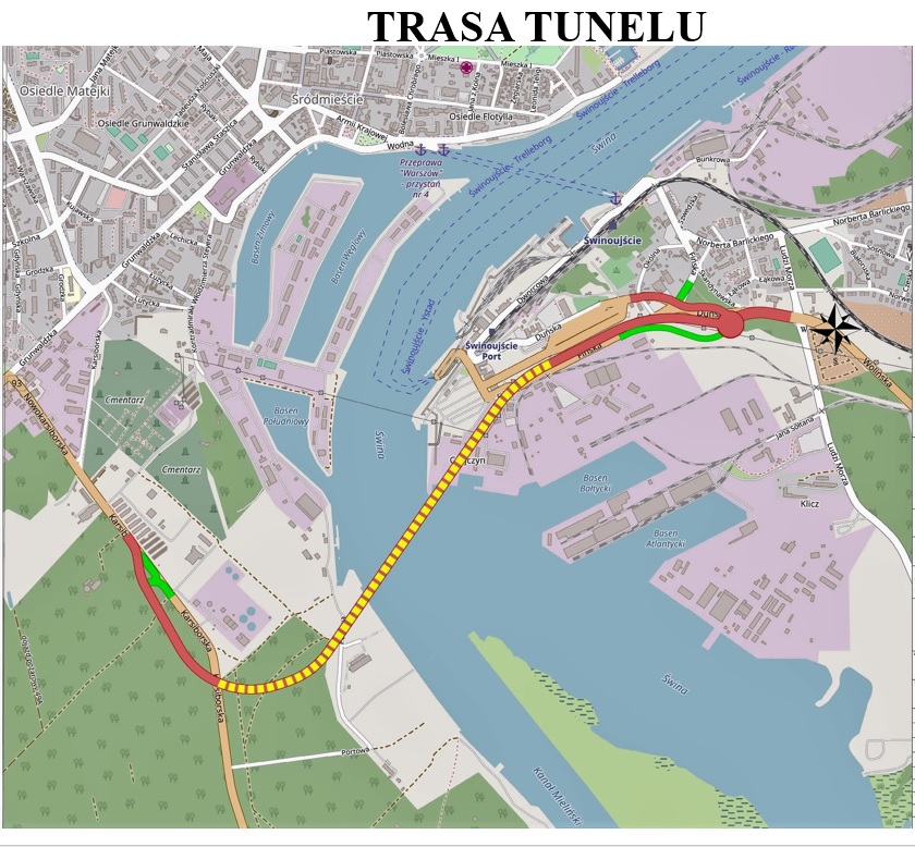 Przebieg tunelu pod Świną zaznaczono kolorem żółtym