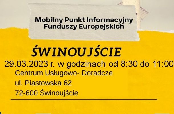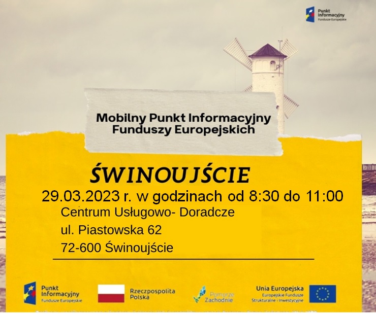 Dyżur specjalisty ds. Funduszy Europejskich oraz Partnerstwa Publiczno-Prywatnego odbędzie się 29.03.2023 tj. środa w godzinach od 08:30-11:00 w siedzibie Centrum Usługowo Doradczego w Świnoujściu przy ul. Piastowskiej 62.